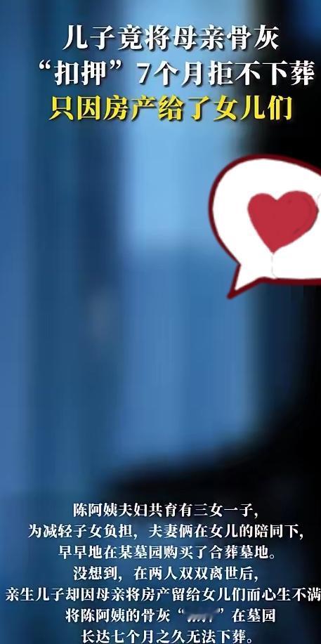 上海男子因遗产纠纷扣留母亲骨灰,亲情竟抵不过一套房? 10月30日报道,上海一男子给母亲办丧事时才知道,母亲数百万的房产只给了3个女儿,他这独子一毛钱没捞到。盛怒之下要求姐妹们放弃房产,遭拒后竟将老母骨灰扣留,不准下葬…… 说真的,这事儿听着就让人脊背发凉!办丧事本是肃穆尽孝的时刻,王某(也就是这位独子)却满脑子都是房产,得知自己分文未得时,当场就炸了锅,指着姐妹们的鼻子骂骂咧咧,那架势仿佛受了天大的委屈。可他就没想过,母亲为啥宁愿把房产全给女儿,也不给他这个“独苗”?大概率是晚年生活里,女儿们的陪伴和照料远胜过他吧,毕竟《民法典》第1130条早就明确,对被继承人尽了主要扶养义务的继承人,分配遗产时可以多分。 更离谱的是,协商不成居然扣骨灰!追悼仪式结束,遗体火化后,三姐妹拿着提前准备好的墓穴证明去办落葬,王某却突然冲出来拦住,直接放话:“房产不重新分,妈就别想入土!” 这话一出口,在场的亲友都惊呆了,谁也没想到他能做得这么绝。要知道,这处合葬墓穴是陈阿姨夫妇早年和女儿们一起选的,早就定好要和老伴合葬,王某作为墓穴认购人,本该成全母亲的心愿,反倒成了阻拦的绊脚石。 这一扣,就是整整七个月!陈阿姨的骨灰被孤零零地放在墓园的寄放处,三姐妹每次去祭拜都忍不住掉眼泪,多次找王某协商,他都油盐不进,甚至放话“除非姐妹仨签放弃继承的协议,否则免谈”。被逼无奈,三姐妹只能一纸诉状把王某和墓园告上法庭,只求让母亲早日安息。这里必须科普下,根据《民法典》,民事活动必须遵守公序良俗,“入土为安”是中华民族的传统伦理,王某以遗产纠纷为由扣留骨灰,早已触碰了道德和法律的底线。 法院审理时,王某还振振有词,说自己是独子,房产就该归他。可法官直接怼了回去:“陈阿姨的公证遗嘱合法有效,她有权处分自己的财产。” 最终判决王某和墓园必须协助办理落葬手续,这才让憋屈了七个月的老人终于“入土为安”。其实明眼人都能看出来,王某的核心问题就是根深蒂固的重男轻女思想,觉得家产就该传男不传女,却忘了赡养父母的义务不分性别,权利和义务从来都是对等的。 大家觉得陈阿姨把房产全给女儿,是不是早就对儿子的表现寒了心?换做是你,遇到这种遗产分配,会选择用极端方式维权吗? 亲情在房产面前,难道就这么不堪一击?王某的行为不仅违背了孝道,更是无视法律和公序良俗的表现。父母含辛茹苦把子女养大,到头来却因为遗产反目成仇,实在让人唏嘘。继承权男女平等早已是法律明确规定的原则,任何以性别为由争夺遗产的行为,都是站不住脚的。 各位读者你们怎么看?欢迎在评论区讨论。