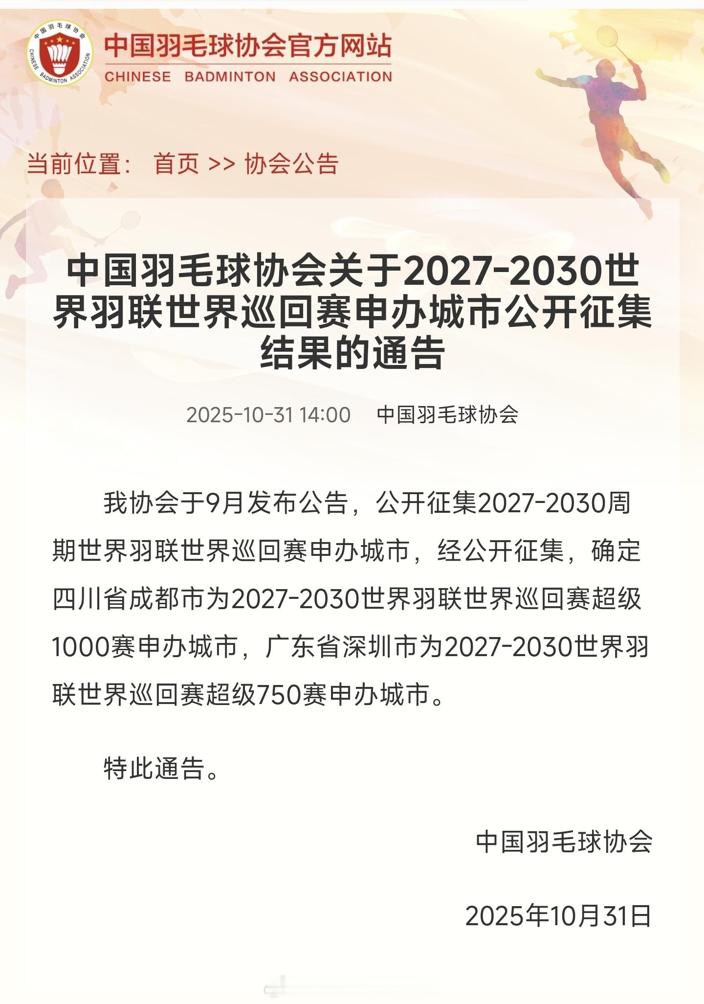 【中国羽毛球协会关于2027-2030世界羽联世界巡回赛申办城市公开征集结果的通告】
