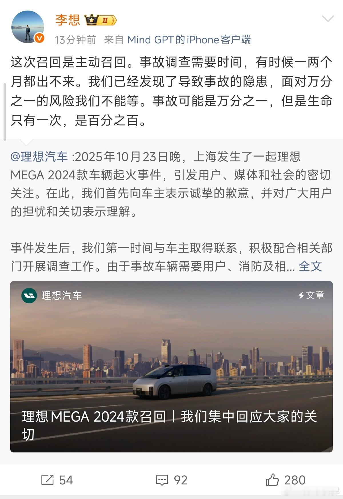 现在MEGA已经开启召回,涉及2024年2月18日至2024年12月27日期间的理想MEGA 2024款,共计11,411辆。