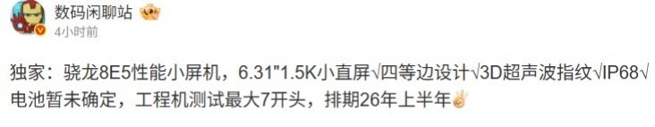 据爆料,该机搭载 6.31 英寸 1.5K 小直屏,采用四等边设计,支持 3D 超声波指纹、IP68 防尘防水,电池暂未确定,工程机测试最大 7 开头(超 7000mAh),排期 2026 年上半年。