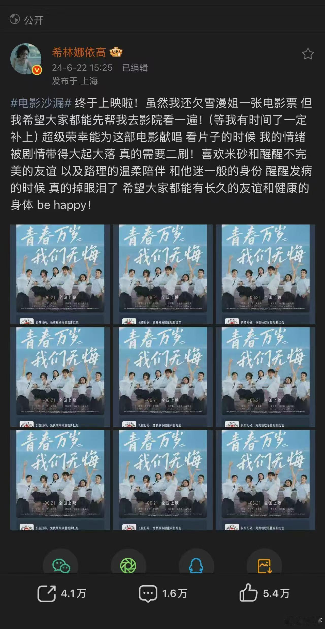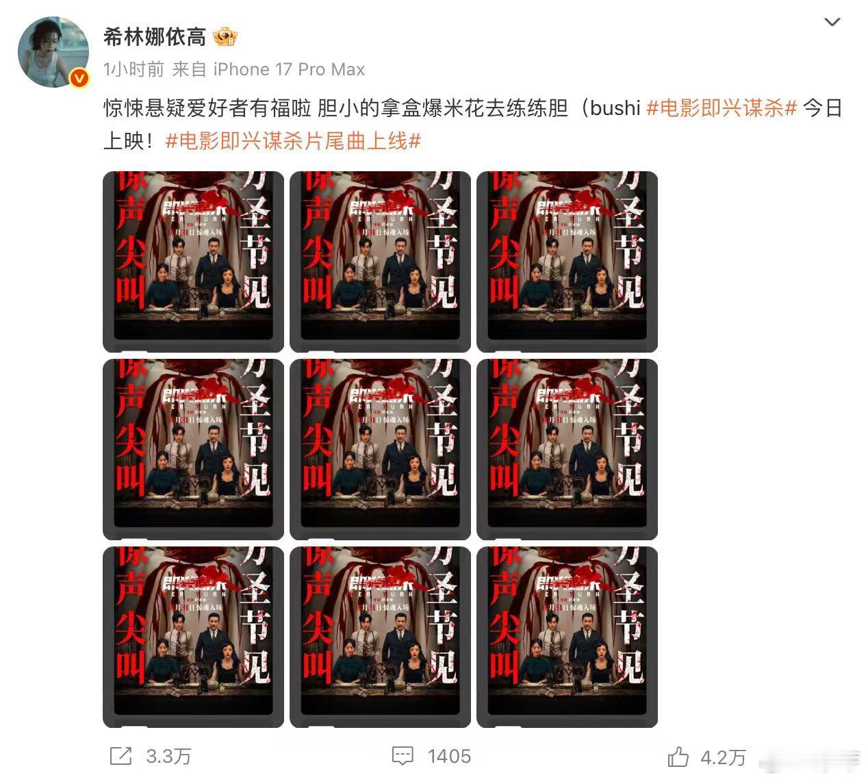 希林娜依高电影ost唱嗨了真包场希林娜依高即兴包场 希林娜依高简直是电影与音乐的梦幻联动使者!为《即兴谋杀》包场,她演唱的《即兴演出》作为片尾曲超带感,让观众在观影结束后仍沉浸其中,这份对作品的热爱与支持太难得!
