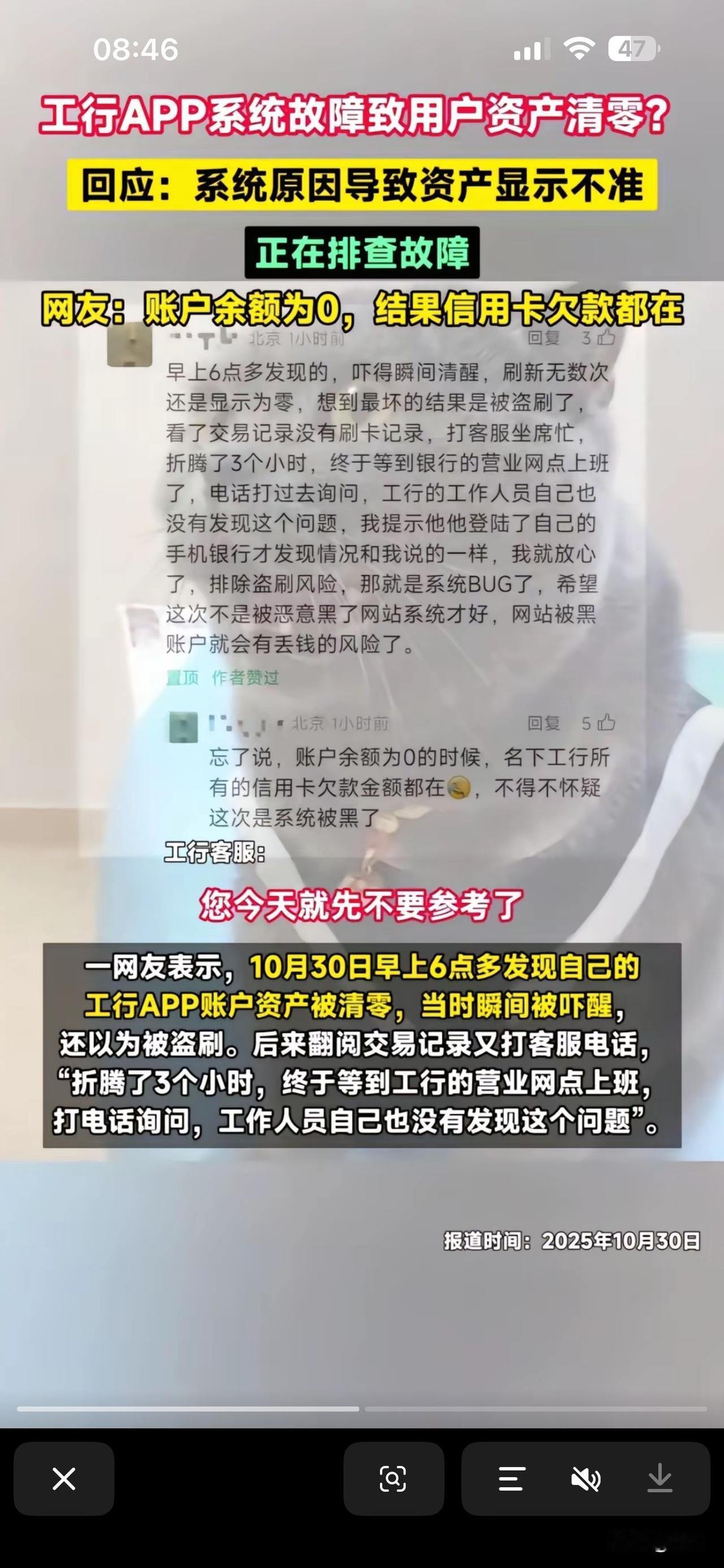 工商银行卡系统故障?显示故障致系统为0? 近期小编发现工商银行App系统故障,导致资产现实为0。但是信用卡💳欠款都在。 记者调查后回应:正在调查中