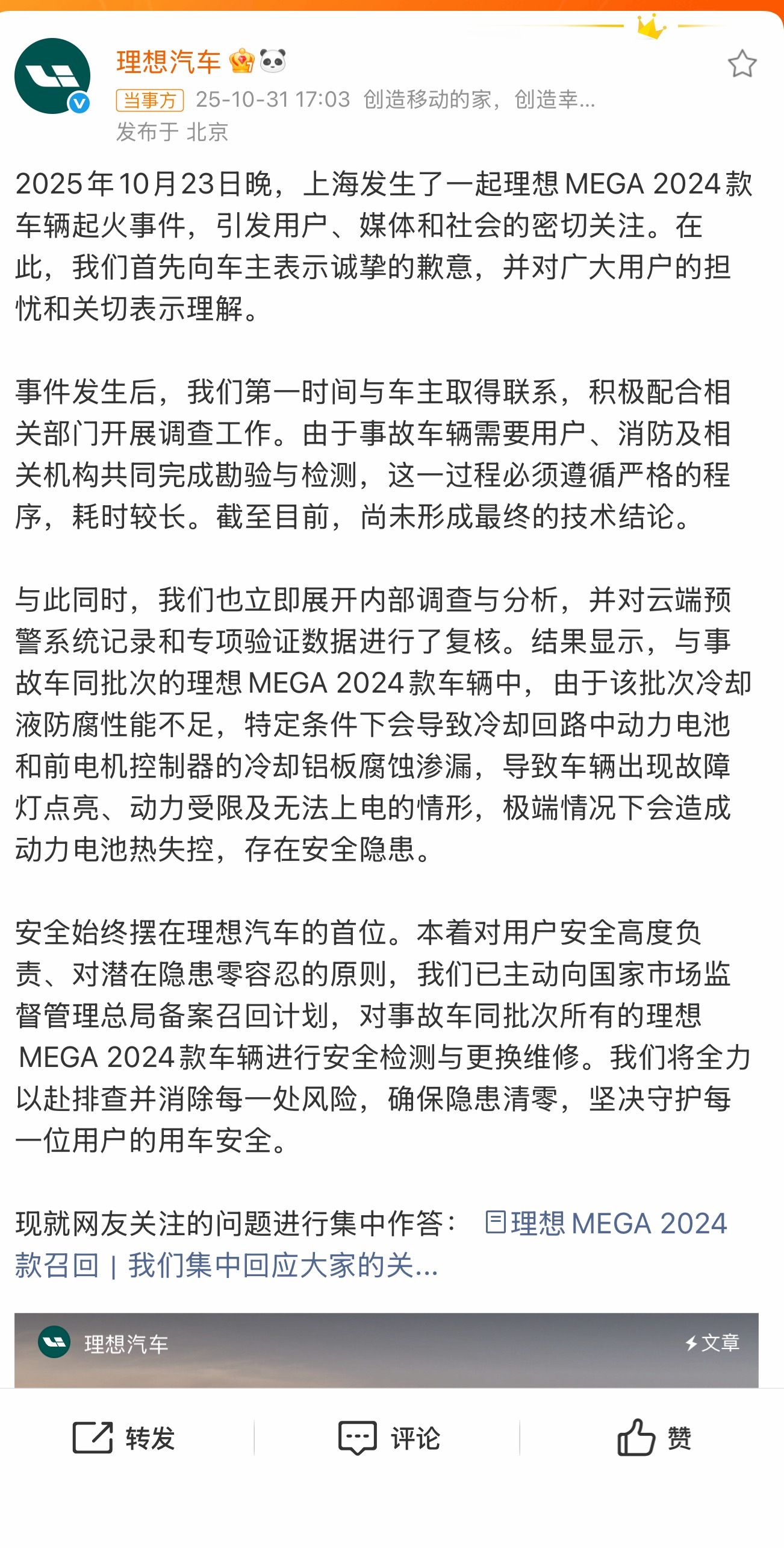 理想MEGA召回,我的那台应该也在召回范围之中。但是官方没有说明前不久的上海着火事故和这次召回的缺陷是否有直接关系。