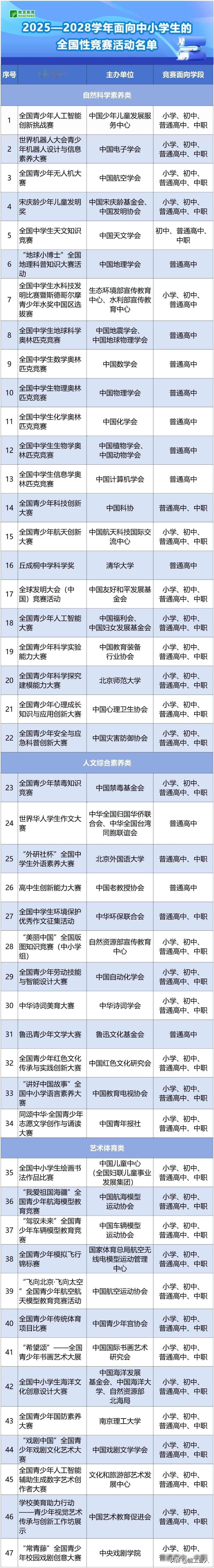 家长慌了,竞赛凉了,教育变了 2025年10月,教育部公布了一份新的竞赛名单,其中列出全国中小学生可以参加的正规比赛项目,总共有47项,这份名单的有效期将延续到2028年8月,时间跨度为三年,每项比赛每年只能举办一次,三年内累计最多举办三次,过去那种“天天有赛、月月有比”的情况,今后不再属于合法范围。 这份名单公布之后,升学这件事就跟加分彻底脱钩了,竞赛获奖既不能帮助学生进入更好的学校,也不能为高考成绩增添分数,高校在招生过程中也再不能暗中参考这些证书,虽然这个政策之前就提过,但这次说得格外明确,态度也更加坚决,过去有人试图钻空子的做法,现在这条路已经被完全堵死。 过去家长打听比赛消息需要四处询问,有时还会遭遇骗局,现在教育部推出统一平台和配套的家长端应用,所有比赛的报名流程、成绩公布和最终结果都在这个平台上公开显示,未在该平台备案的比赛都属于违规行为,今后任何机构私下组织比赛,家长通过平台就能直接识别,不再需要盲目猜测。 政策规定归政策规定,下面的人不一定照办,有些地方把竞赛换个名称,叫它“素养展演”或者“创新挑战”,实际上还是选拔成绩好的学生,一些民办学校悄悄联系主办单位,推荐自己的学生去参加,培训公司也推出所谓“包赛”服务,交了钱就保证能获奖,这些做法现在不敢公开进行,但私下里还在继续。 家长们的想法也在跟着改变,过去总觉得孩子没拿到奖状就是落后在起跑线上,现在很多家长不再这样认为了,在一线城市里,不少家长带着孩子学习AI编程,组织他们参与社区调查,或是接触非遗活动,这些家长更看重孩子在过程中有没有认真动脑筋,能不能和他人合作,是不是能够坚持完成,至于最后有没有证书反而不那么重要,这种变化其实也和新课标提倡的方向合得上。 国外情况有所不同,美国青少年可以参加很多学术、体育和艺术类的比赛,这些比赛大多鼓励参与和团队协作,比如机器人比赛和科学展,重点不在于选出冠军,而是让孩子们动手实践、动脑思考、学会合作,中国虽然已经清理了一批以发证书为主的竞赛项目,但还没有真正推广这种模式,大家仍然习惯通过比赛选拔优秀人才,而不是培养人才。 我朋友的孩子去年在数学竞赛中拿到一等奖,今年这位父亲却不再让孩子继续参加,他表示,之前参与竞赛主要是为了升学考虑,现在这个目标已经实现,再花时间在这上面意义不大,不如让孩子去学一些实际有用的技能,这种想法听起来虽然现实,却也很实在,教育本身不应该只围绕考试打转,孩子也不该被当成装分数的容器。 现在比赛数量减少,标准变得严格,家长们反而感到轻松一些,不用再奔波于各个培训机构之间,也不必为证书的事情焦虑,当然还有部分家长仍在坚持原有方式,认为没有竞赛就失去上升通道,但整体趋势已经明朗,教育这件事需要时间沉淀,急也急不来。
