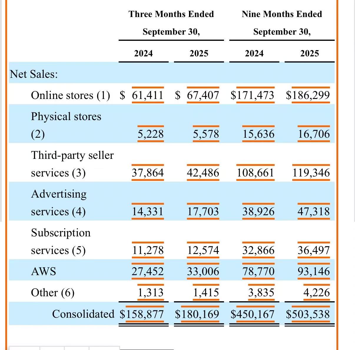 亚马逊2025Q3营收1803亿美元 • 营收数据:亚马逊2025年第三季度净销售额为1801.69亿美元,同比增长13%。其中净产品销售额为740.58亿美元,净服务销售额为1061.11亿美元。 ◦ 按地域划分:北美部门净销售额为1062.67亿美元,同比增长11%;国际部门净销售额为408.96亿美元,同比增长14%;AWS云服务净销售额为330.06亿美元,同比增长20%。 ◦ 按业务类别划分:在线商店收入674.07亿美元,同比增长10%;第三方卖家服务收入424.86亿美元,同比增长12%;广告服务收入177.03亿美元,同比增长24%;实体商店收入55.78亿美元,同比增长7%;订阅服务收入125.74亿美元,同比增长11%。财报显示营业利润为174.44亿美元,若不计入与联邦贸易委员会法律和解相关的25亿美元支出以及18亿美元的预计裁员成本,营业利润将达到217亿美元。 销售成本(营收成本)为886.70亿美元,较2024年同期的809.77亿美元增长9.5%,涨幅低于营收增速,主要得益于零售业务规模效应及物流网络效率提升,一定程度对冲了商品采购与履约环节的成本压力。 营销费用达116.86亿美元,同比增长10.15%(去年同期106.09亿美元),增长主要源于广告服务业务扩张(同比增长24%至177亿美元)、购物聊天机器人“Rufus”等新工具推广,以及为旺季销售提前布局的市场投放。 管理费用(总务和行政支出)为28.75亿美元,同比增长6%(去年同期27.13亿美元),增幅相对温和,反映出公司在组织管理上保持成本控制力度,未因业务扩张出现行政开支的大幅攀升。 • 利润:净利润为211.87亿美元,同比增长38%;运营利润为174.22亿美元,与去年同期的174.11亿美元相比略有增长。财报数据显示净利润为211.87亿美元(约212亿美元),同比增长38.6%,运营利润为174.44亿美元,若不计特殊费用运营利润为217亿美元。