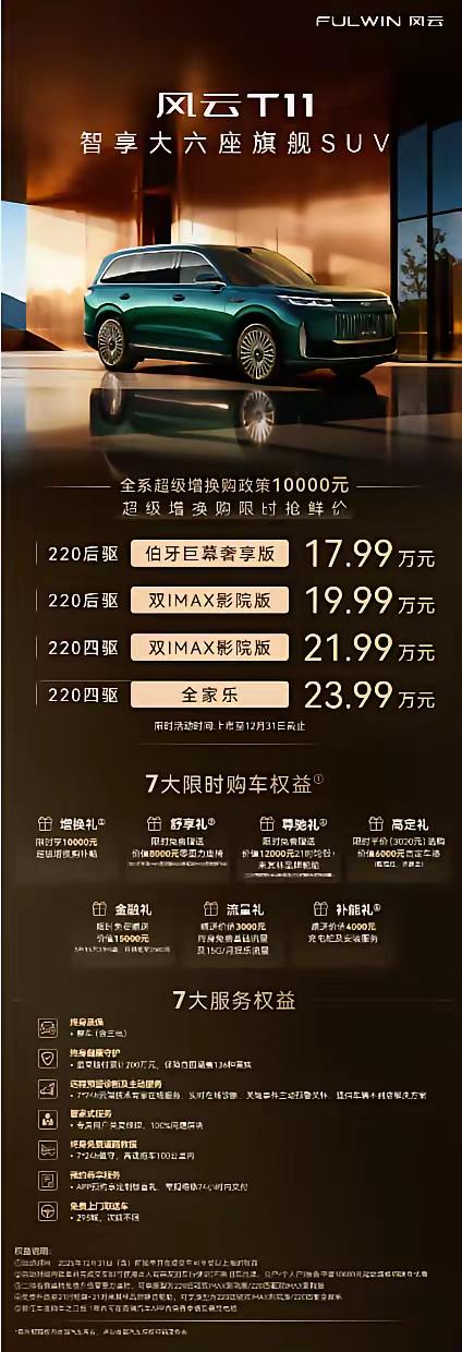 奇瑞风云T11今晚上市,共有四个版本,有后驱有四驱,限时增换价17.99~23.99万元,同时也有7大限时购车权益一并推出。“532”的车身尺寸绝对够用,有纯色和拼色车漆,内饰也提供了三种配色方案。30寸一体大屏用的是8255芯片,可以连续执行40个指令不卡顿,毫秒级的响应,再搭配6个音区,有事儿你招呼它就行了。猎鹰700高阶辅助驾驶,城市、高速NOA都具备,全系标配11个安全气囊,结合磐石车身2.0,让T11变的更加安全。1.5TGDI增程发动机,搭配前双叉臂、后五连杆+CDC,犀牛方刀电池,纯电续航超220公里,CLTC综合续航1400公里。 听起来,T11无疑是一款硬核的车,挑战着市场中众多电动汽车的既有规则。车身尺寸“532”挺大,毫无疑问是对空间的最大尊重,特别是对于越来越注重车内舒适感的消费者来说,这个配置无疑是加分项。再者,30寸的超大屏幕成为了这款车的一个亮点,不少人已经开始表示,开车时的“娱乐性”几乎是与手机、电视相媲美了。这种大屏体验不仅仅是为了好看,更是实际操作中一种便利,能在驾驶中快速实现智能交互,而不被分心——一个能随时应对“40个指令”的芯片,简直是对现代驾驶体验的完美诠释。 此外,T11的“猎鹰700高阶辅助驾驶”也引起了不少人讨论,尤其是“城市、高速NOA(全自动驾驶)”的能力,显然在智能驾驶领域,它已经做到了比肩特斯拉。这一点,已经从某种程度上摆脱了过去奇瑞在消费者眼中的传统印象,似乎有了不容忽视的技术底气。从安全角度来看,11个安全气囊的配置也让这款车成为了碰撞中最坚固的堡垒,再加上磐石车身2.0的加持,整车的防护性能几乎可以说达到了极致。 但,T11究竟能不能打破电动汽车市场的现有格局?这是一个值得思考的问题。奇瑞这次的定价策略显然是向消费者“实惠”伸出了橄榄枝,起售价从17.99万元到23.99万元的范围,也让它比不少同类车型的定价更加具有吸引力。然而,市场上竞争同样激烈,特斯拉、蔚来、理想等品牌早已深耕其中,而中国消费者对“智能”和“安全”的关注已经趋于理性。大屏、智能驾驶、长续航都已经不是新鲜事,如何将这些技术应用得更加精准且不生硬,才是奇瑞这次能够脱颖而出的关键。 有网友评论道:“新车好是好,但最怕的就是车主体验和品牌认同感不强。大家对奇瑞的信任度如何,能不能长时间维持?这才是我关心的问题。”确实,对于一些消费者来说,品牌背后的沉淀和口碑依然至关重要。尽管奇瑞在中国市场有着不小的份额,但在高端智能电动汽车领域,它如何摆脱传统品牌的局限性,向消费者证明自己的创新实力,仍是一个不小的挑战。 另外,尽管T11在续航方面做了非常大的努力,纯电续航超220公里,综合续航达到1400公里,但当下很多消费者依然将“充电”问题视作购买电动汽车时的一大障碍。充电桩的不普及以及充电时长的“焦虑”依旧是摆在所有电动汽车面前的一道难题。随着电动汽车的普及,这些“硬伤”或许能在未来得到解决,但短期内消费者在购车决策时,仍然需要对这些问题有足够的预期。 从整体来看,T11无疑是一款有创新意识并努力向更高端领域迈进的电动汽车,它在智能技术和安全性上的综合表现值得肯定。不过,它能否突破消费者对品牌和长期使用感受的固有印象,还是要看它后续的市场表现和用户的实际反馈。如果你正打算购买一款电动汽车,可能不妨去体验一下T11,看它的实际表现能否达到你的期望。奇瑞风云a9l 奇瑞风云T9 奇瑞风云suv 奇瑞风云t 奇瑞风云e9l 奇瑞风云A8L 奇瑞风云t8 奇瑞风云a5i 你会选择奇瑞风云T11吗?或者你觉得它在未来的电动汽车市场中能够成功吗?欢迎在评论区分享你的想法,让我们一起探讨这款新车的市场潜力。