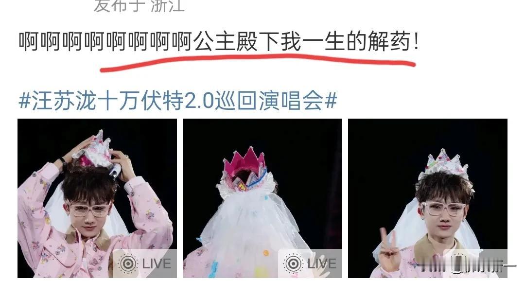 现在有一个现象 就是会把男艺人称为“公主” 看见汪苏泷演唱会词条一点进去就被带着王冠头纱的他吓到了[捂脸] 粉丝还在底下大喊公主、漂亮 我也是跟不上时代了啊 我能理解把43岁张韶涵称为公主,毕竟她演唱会服饰是真的美到不行 但真的不能理解如此叫36岁的汪苏泷啊!