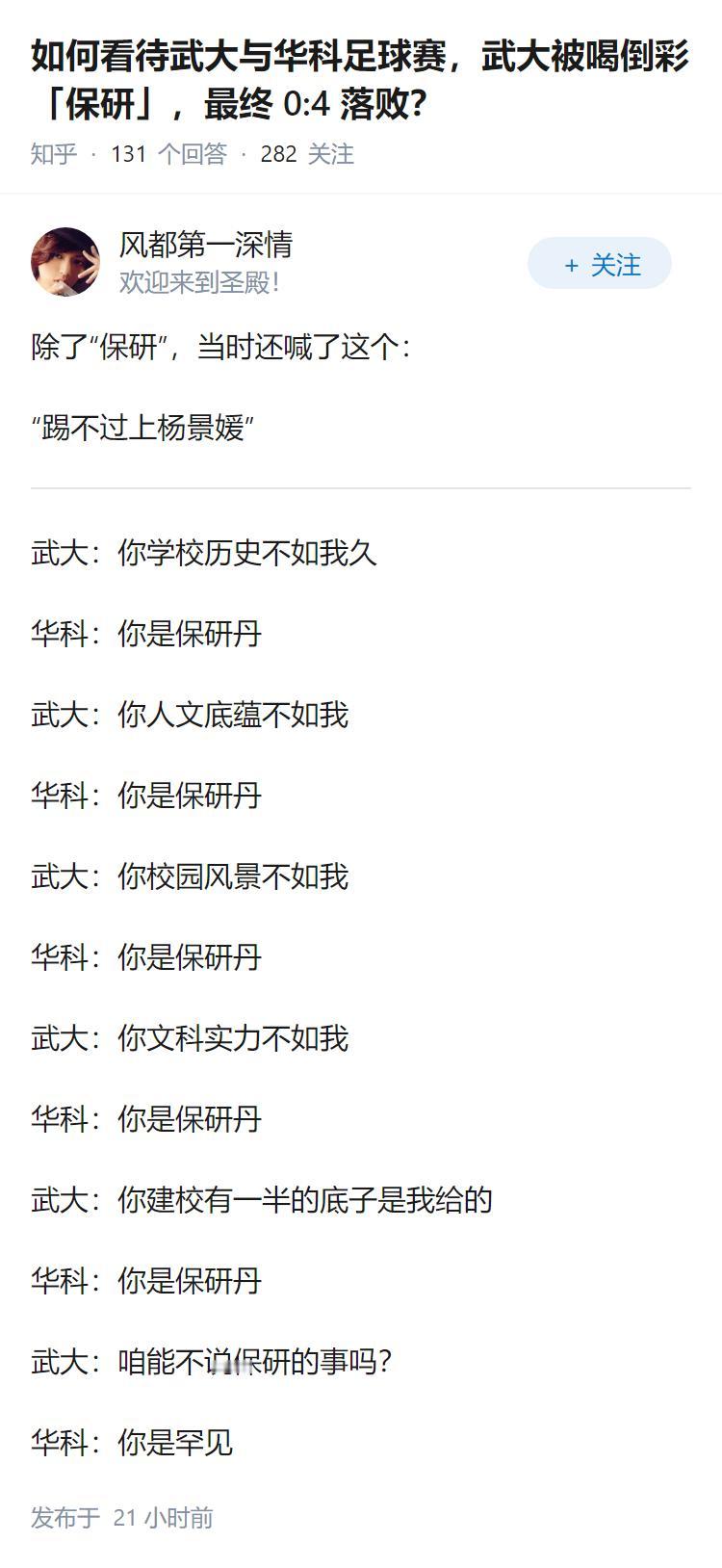 如何看待武大与华科足球赛,武大被喝倒彩「保研」,最终 0:4 落败?