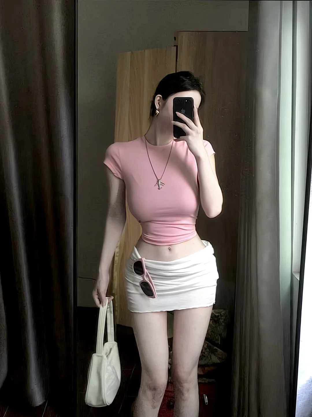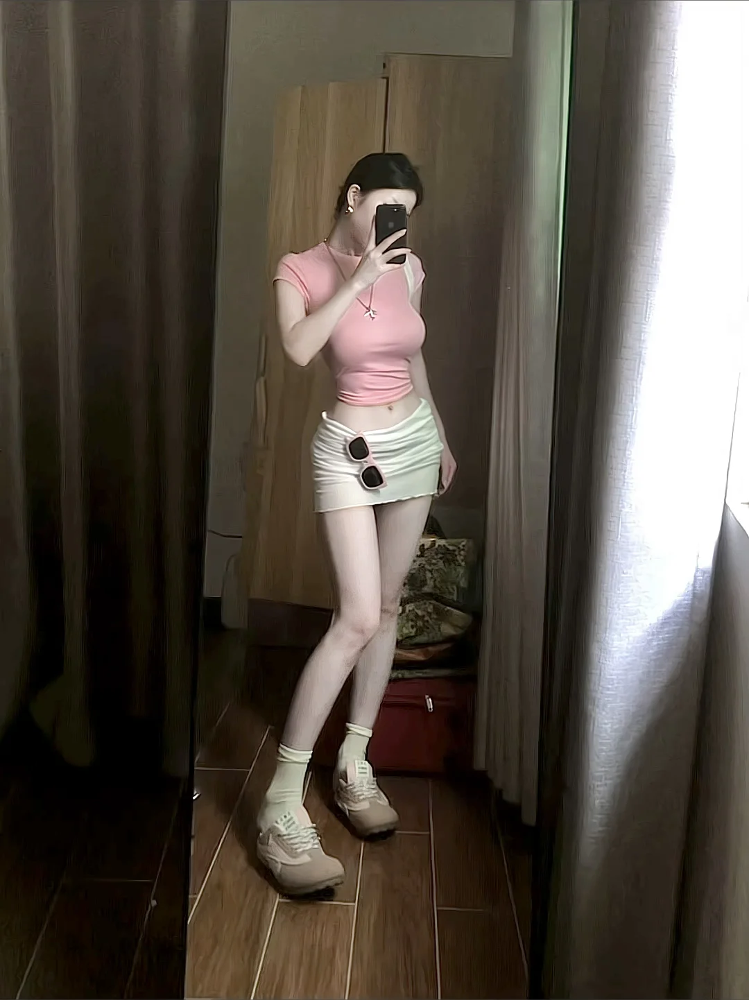 粉色连衣裙,优雅气质,镜前自拍,美不胜收!