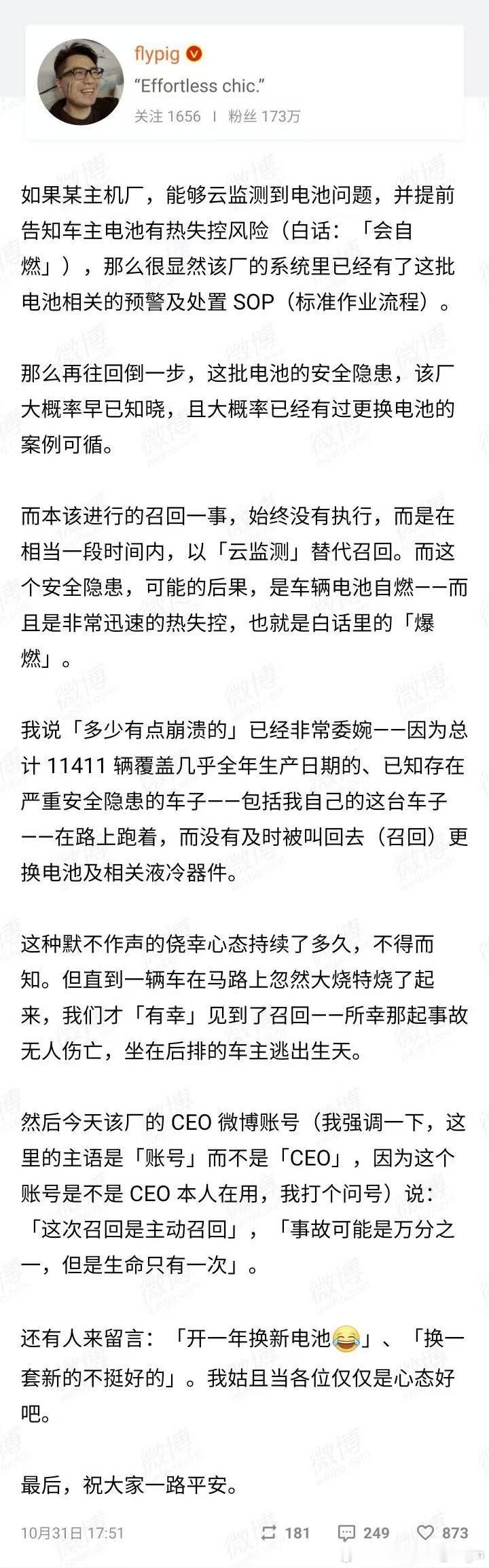 老汤哥还特别提了一句“要是知道哪怕是有一丝可能会有热失控风险,我们也早就会选择召回,而不是等到今天了...”。