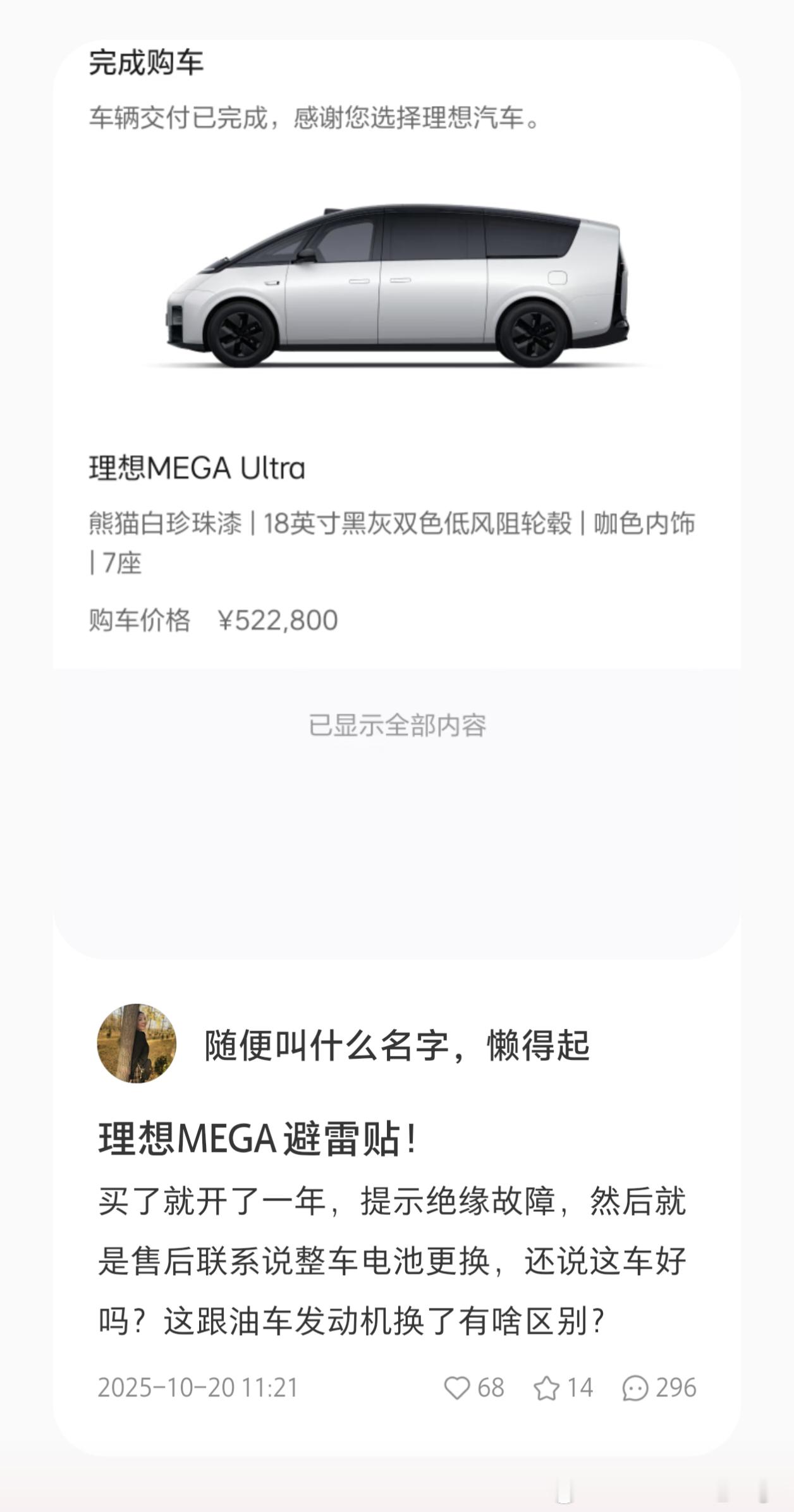 ➡️ 这次MEGA爆燃事件发生的日期为10月23日,而我最早在10月初就看到过与召回相关的帖子,刚才随便搜了一下就找到一篇发布于10月20日的地瓜帖子,内容明确提到“提示绝缘故障,然后就是售后联系说整车电池更换”。(图2)