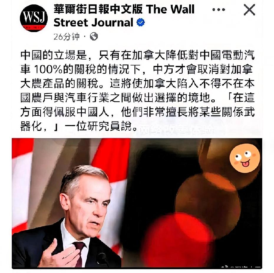 就在刚刚! 华尔街日报最新报道,中国在与加拿大的谈判中表示,只有当加拿大将对其电动汽车的100%关税降低时,它才会取消对加拿大农产品的关税。 东方大国与加拿大谈判中,表明立场:只有你把电动汽车100%关税取消了,我才考虑把对你农产品的关税取消。 此时此刻,加拿大只能在农户与汽车行业之间做出艰难的选择。 东方大国以加拿大单边贸易保护主义为由,宣布对加拿大农产品加征关税。 华尔街日报援引知情人士消息称,加拿大与东方大国的谈判破裂。 东方大国驻加拿大大使王镝在谈判破裂后公开声明:这是对等的反制。 加方于2024年10月1日对我电动汽车加征100%关税,于10月15日对我钢铁和铝产品加征25%关税。 这两项措施均违反世贸组织规则,东方大国以2024年9月启动反对歧视调查为依据,于2025年3月起对加拿大农产品加征关税,符合国内法与国际法。 而且,东方大国提出的先取消不合理措施,后对等调整的要求,加方也完全可以接受。贸易应讲公平,讲势均力敌,讲互惠互利,讲规矩,而不应讲强权和欺凌。 加方在2024年10月1日将对我电动汽车加征100%关税,这100%关税是对我单边贸易保护主义的先发制人反击。 我尊重加方提出的先取消不合理措施,再考虑对等调整的要求,但不接受加方以继续实施不合理措施作为理由拒绝取消100%关税。 我先取消不合理措施,加方要怎么对等调整,你们自己看着办。 加拿大加关税 麻烦看官老爷们右上角点击一下“关注”,既方便您进行讨论和分享,又能给您带来不一样的参与感,感谢您的支持!