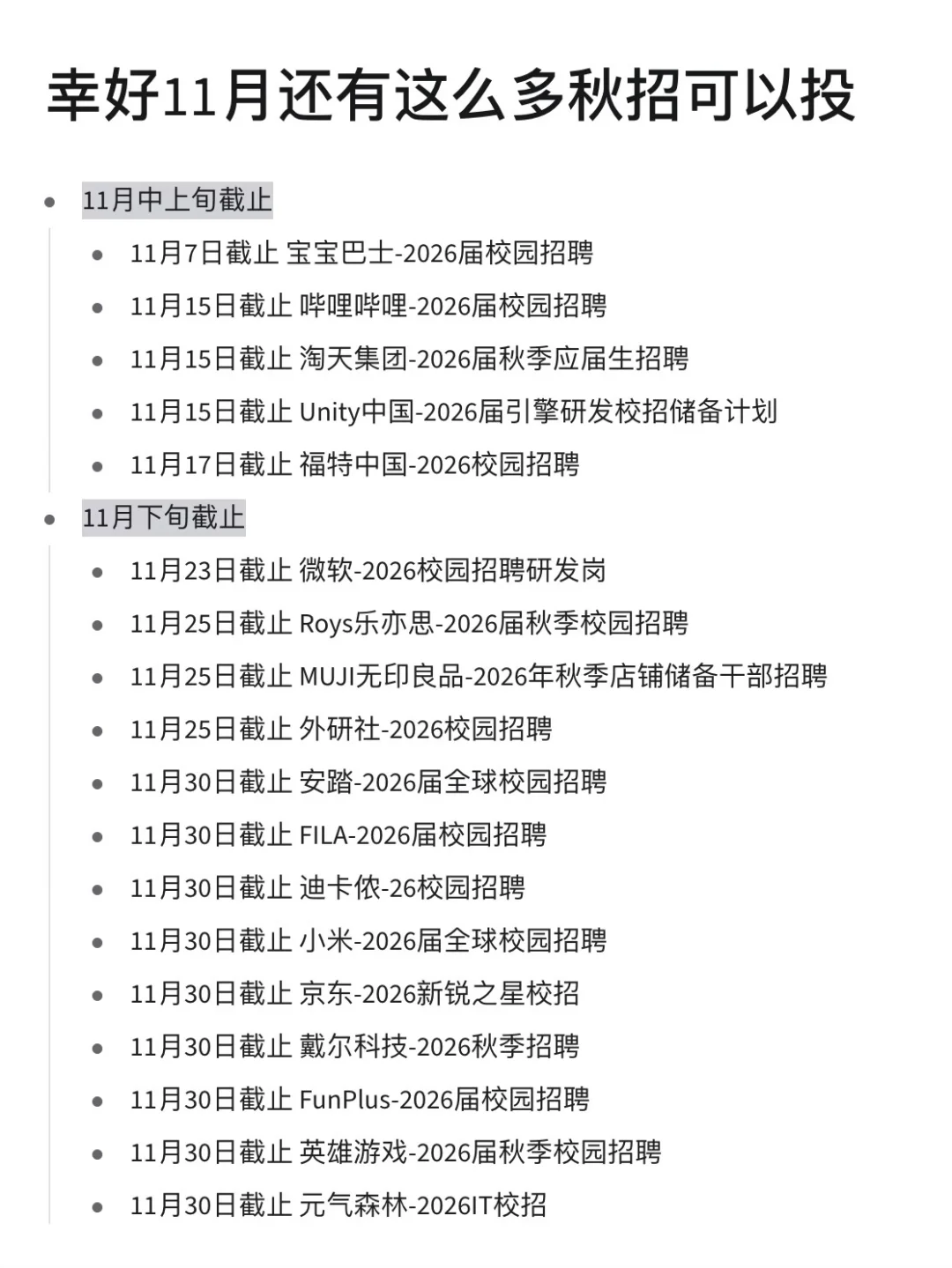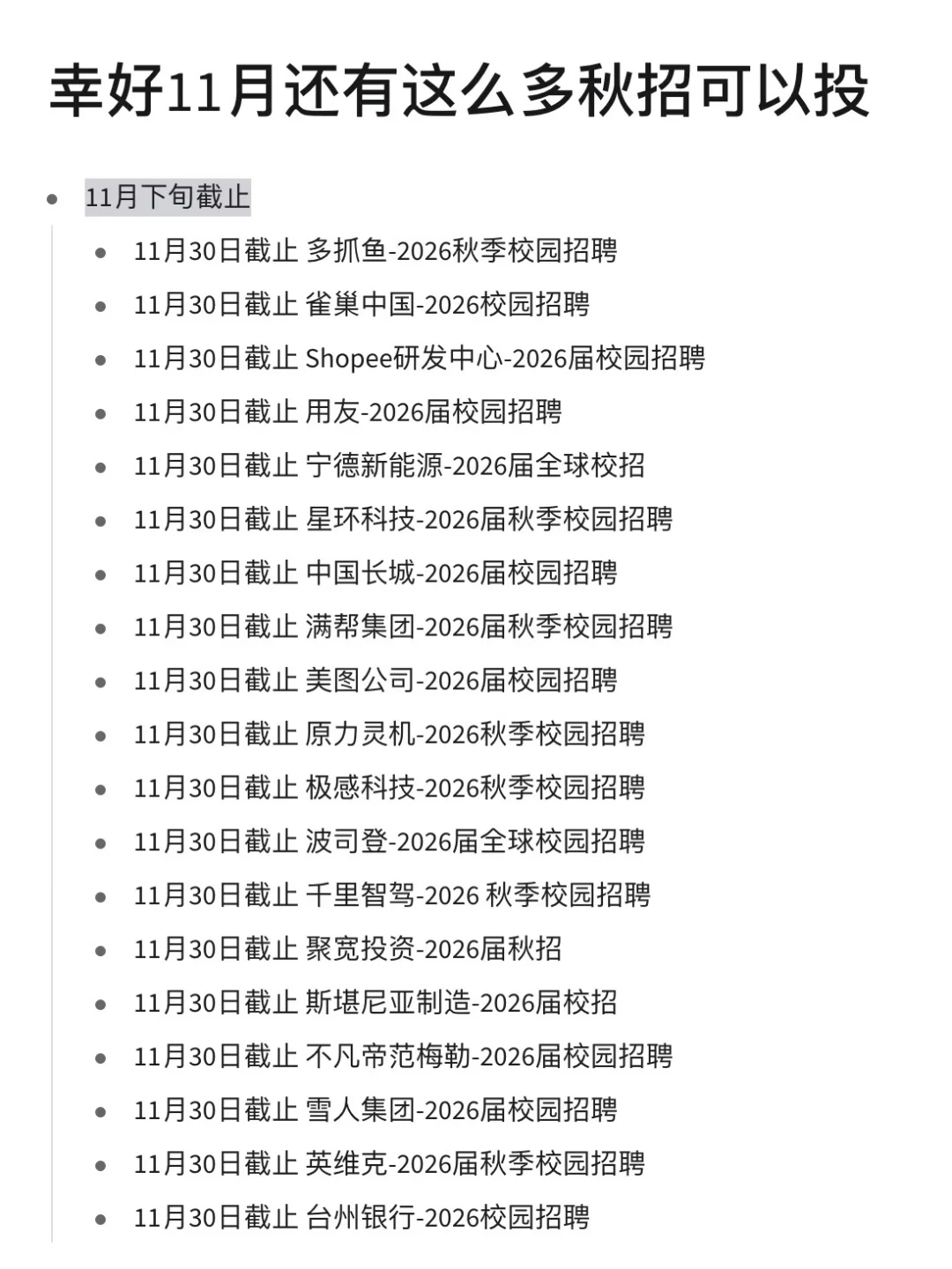 以为11月秋招就结束了,结果这些公司还在悄悄捞人,而且很多都免笔试,再不投就真的赶不上秋招末班车啦 . 11月作战计划 1️⃣主攻才开放岗位 2️⃣挖掘即将截止岗位 3️⃣大公司扩张的业务线 . 坚持日更✊🏻,帮大家在找工作路上顺利拿到offer! .