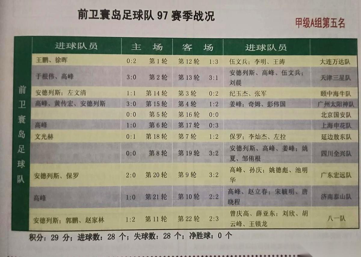 现在的小年轻可能都不知道,当年甲A,半道上杀出来一个前锋,叫安德雷斯。 就是97年的前卫寰岛,那支升班马。 施拉普纳带队,后防线俩国脚,前面是“快马”高峰和外援保罗。这阵容已经够唬人了,结果踢着踢着,又来了个安德雷斯。 这哥们儿就像个即插即用的U盘,来了就进球,效率高的吓人。 那一年,一支刚从甲B上来的队,最后拿了第五。你敢信? 现在想想,那时候的足球真简单,也真带劲儿。一个好外援,真能盘活一支队。一个夏天,就能让你对这支队充满幻想。 后来安德雷斯去了哪儿,很多人都忘了。 但97年那个夏天,他就是重庆足球上空,最亮的那颗星。