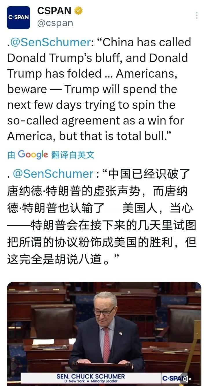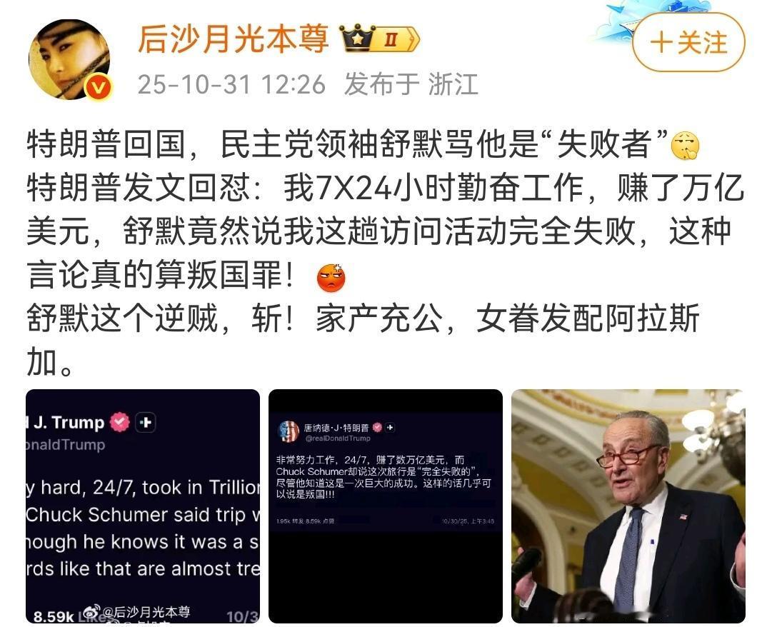 美国版本的攘外必先安内。 (如图所示)美国总统特朗普的亚洲之行,为美国争取了大量日韩的投资,金额可能达到万亿美元。结果刚回来,就受到国内政治对手民主党领袖舒默的嘲笑,被讥讽为失败者,虚张声势,被对手戳破。是可忍孰不可忍,必须要攘外必先安内,彻底清算这些民主党的挑衅。