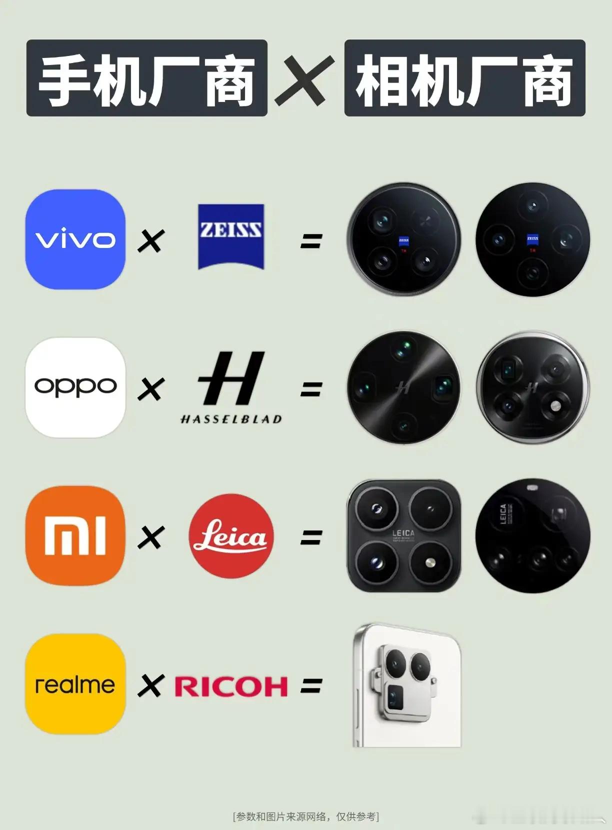目前主要有:vivo与蔡司、OPPO与哈苏、小米与徕卡,还有真我GT8系列和理光的合作。