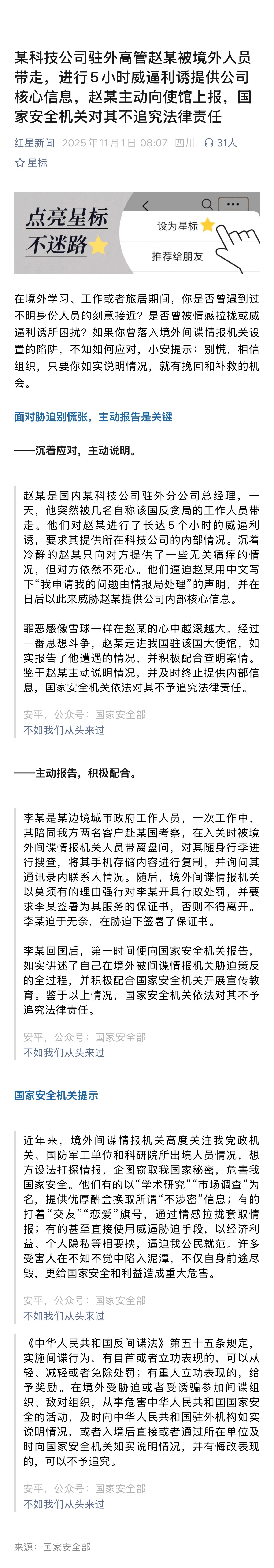 【#边境城市工作人员被间谍胁迫策反#】#科技公司驻外高管被威逼利诱5小时#据国