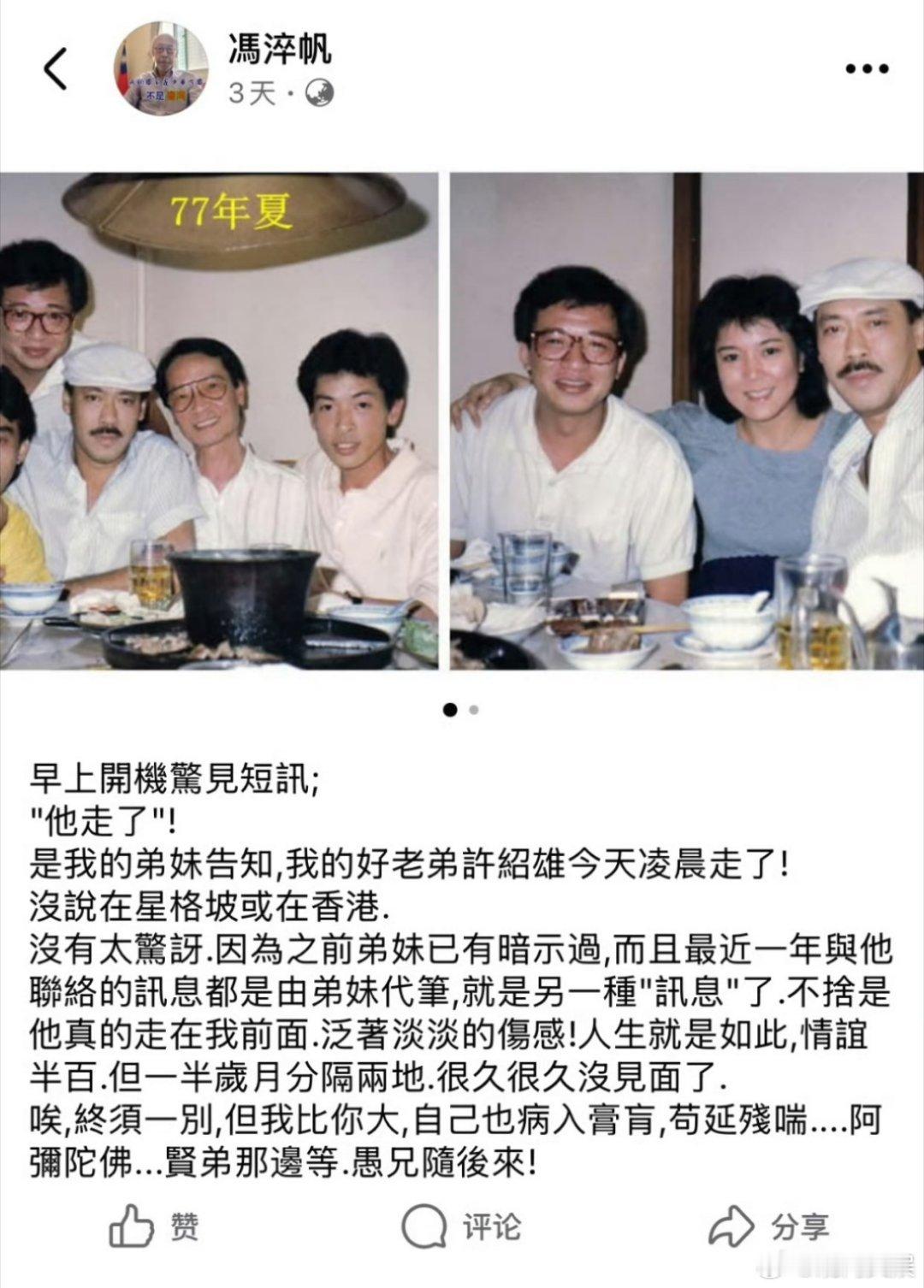 三天前,他在悼念许绍雄时写道:“唉,终须一别,但我比你大,自己也病入膏肓,苟延残喘…阿弥陀佛,贤弟那边等,愚兄随后来!”