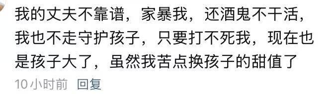 我的丈夫不靠谱,家暴我,还酒鬼,不干活,我也不走。 我守护孩子,只要打不死我。 现在也是孩子大了,虽然我苦点换孩子的甜值了。 看完这个留言我都惊呆了。 我搞不懂这个女人是怎么想的。 你天天挨打,你的孩子哪来的甜? 你孩子的爹是个酒鬼,你孩子哪来的甜? 这个爹不干活还酗酒家暴妈妈。你的孩子从哪里去感觉甜? 我真是服了。 字里行间流露出一种骄傲,你看我挺过来了。 你挺过来,孩子大了。 最终目的是给你孩子留着一个酗酒家暴不干活的爹吗? 这到底是什么思维? 我是理解不了。 朋友们,你们理解吗?
