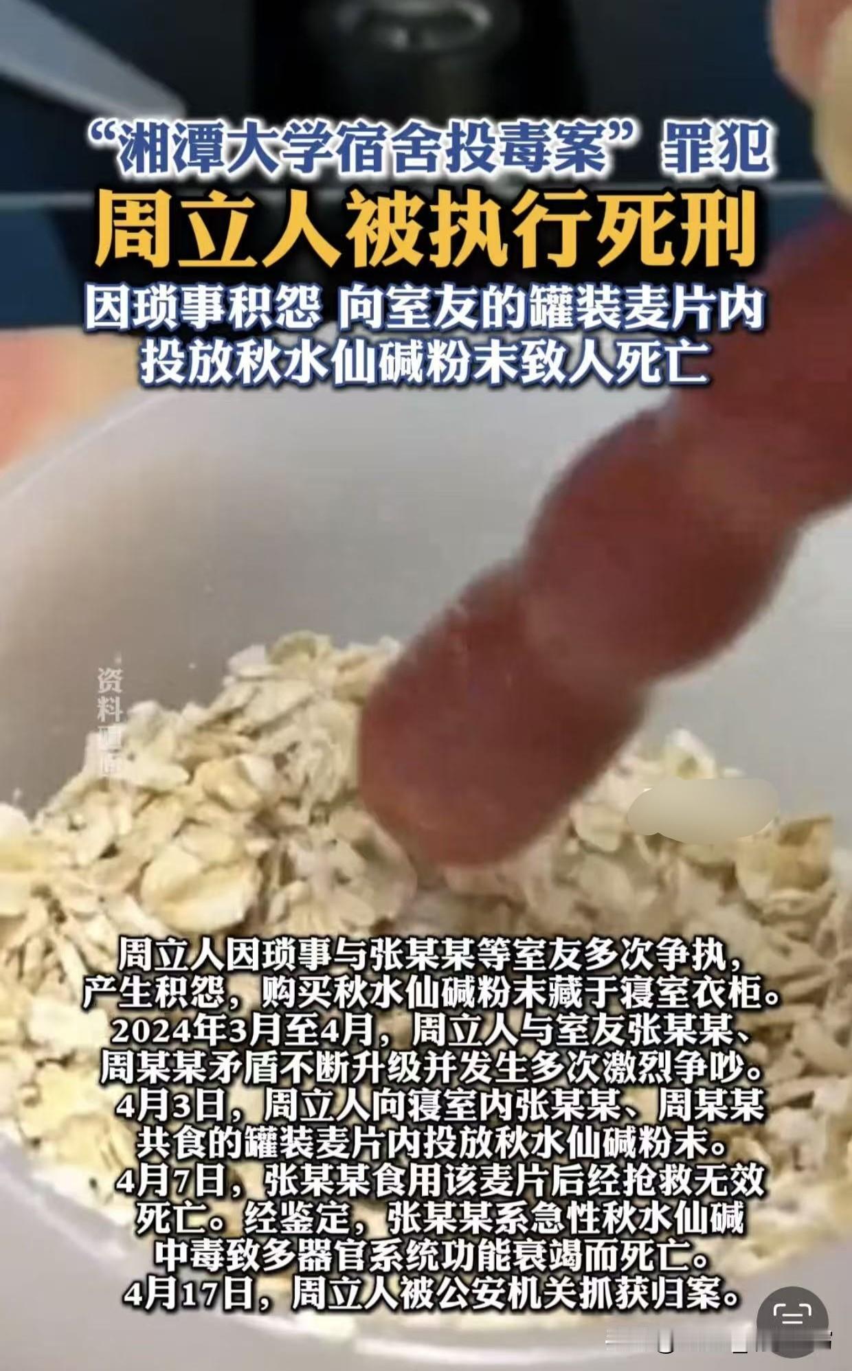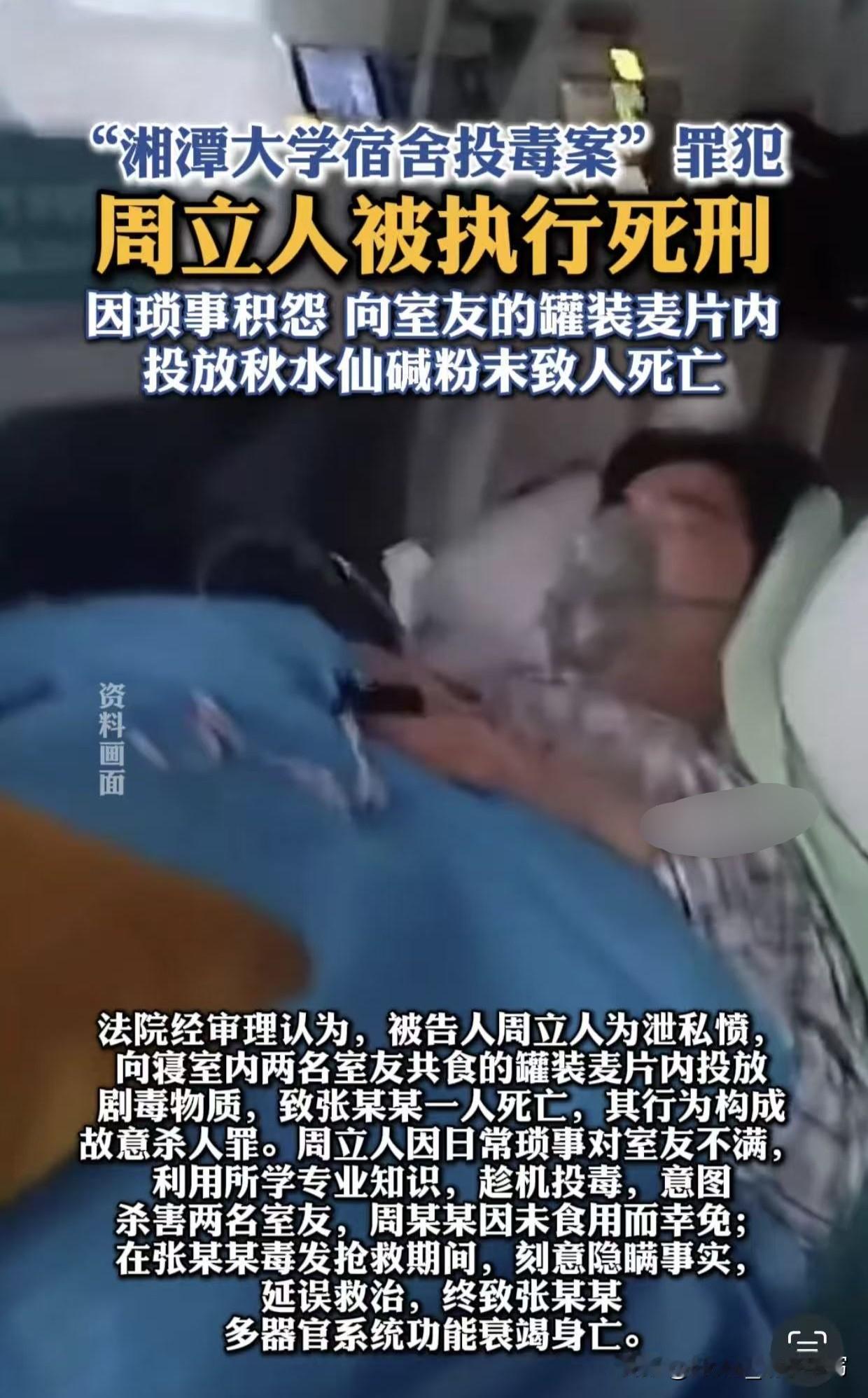 27岁硕士生,因为室友要调宿舍,竟投毒杀人! 湘潭大学研究生周立人,表面老实, 背地里却因为和室友吵架、被申请调寝,记恨在心。 偷偷上网买剧毒秋水仙碱,悄悄倒进大家一块吃的麦片里。 室友吃了几天后中毒身亡,才25岁,人生刚开头就没了。 最吓人的是,他不是冲动,是冷静策划: 买毒、藏药、投毒,一步步像在写论文。 高学历啊,可知识没用来救人,反而用来害命,太讽刺了! 从马加爵、林森浩,到今天的周立人,哪个不是学霸? 可分数再高,心里要是黑了,学历就成了作恶的帮凶。 咱们光会教孩子刷题,却不管他会不会控制情绪, 懂不懂尊重生命,那教育就是失败的。 孩子可以不拔尖,但不能没良心;可以成绩一般,但不能心理扭曲。 这事儿值得每个家长警醒!你有觉得人品比分数重要吗? 转给更多人看看,一定要守护孩子的心理健康! 对此你怎么看?