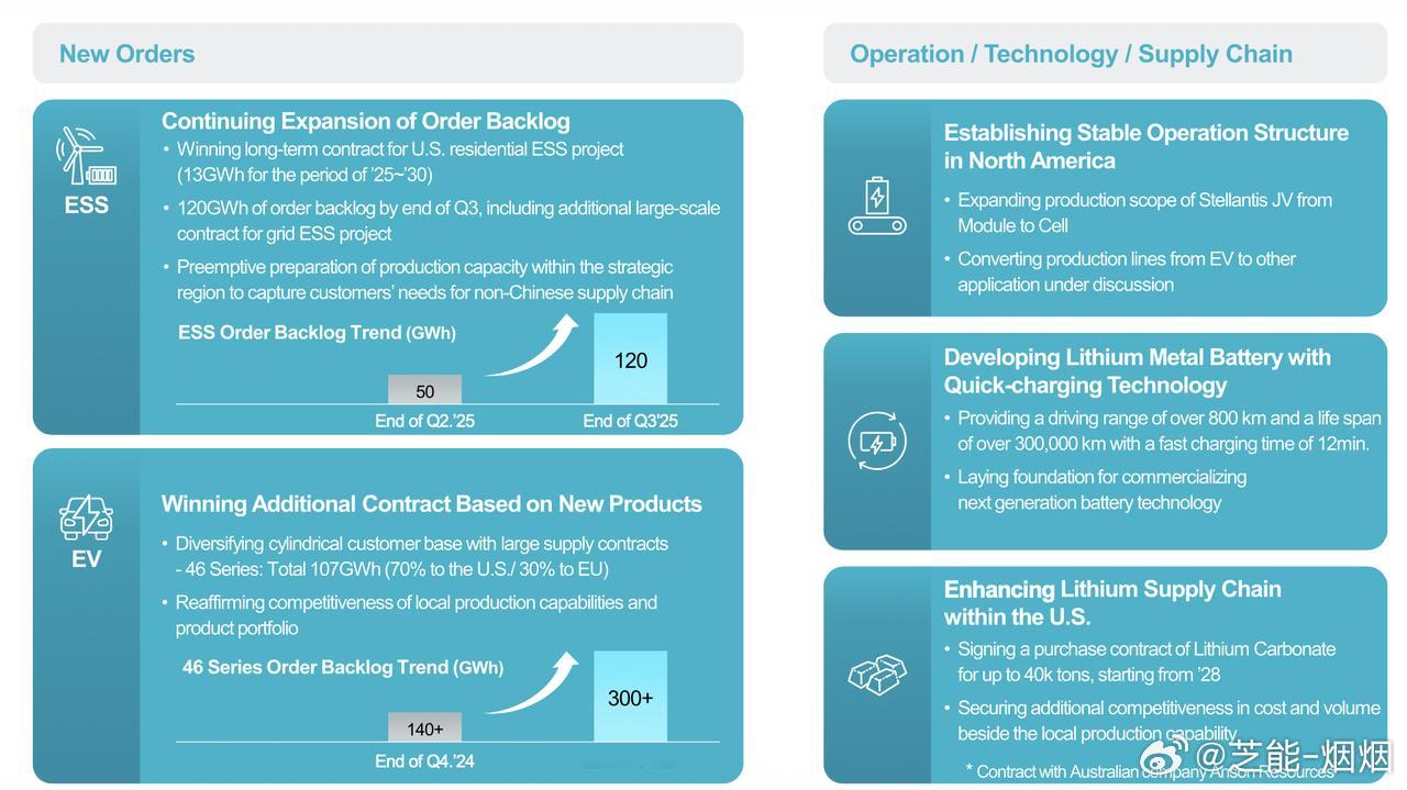 新拿 120GWh 储能订单,46 系圆柱电池订单超 300GWh,靠电动车与储能双轮驱动。战略上覆盖全电池形态,储能端还延伸系统服务,加码本地化生产和成本控制,应对市场变化~