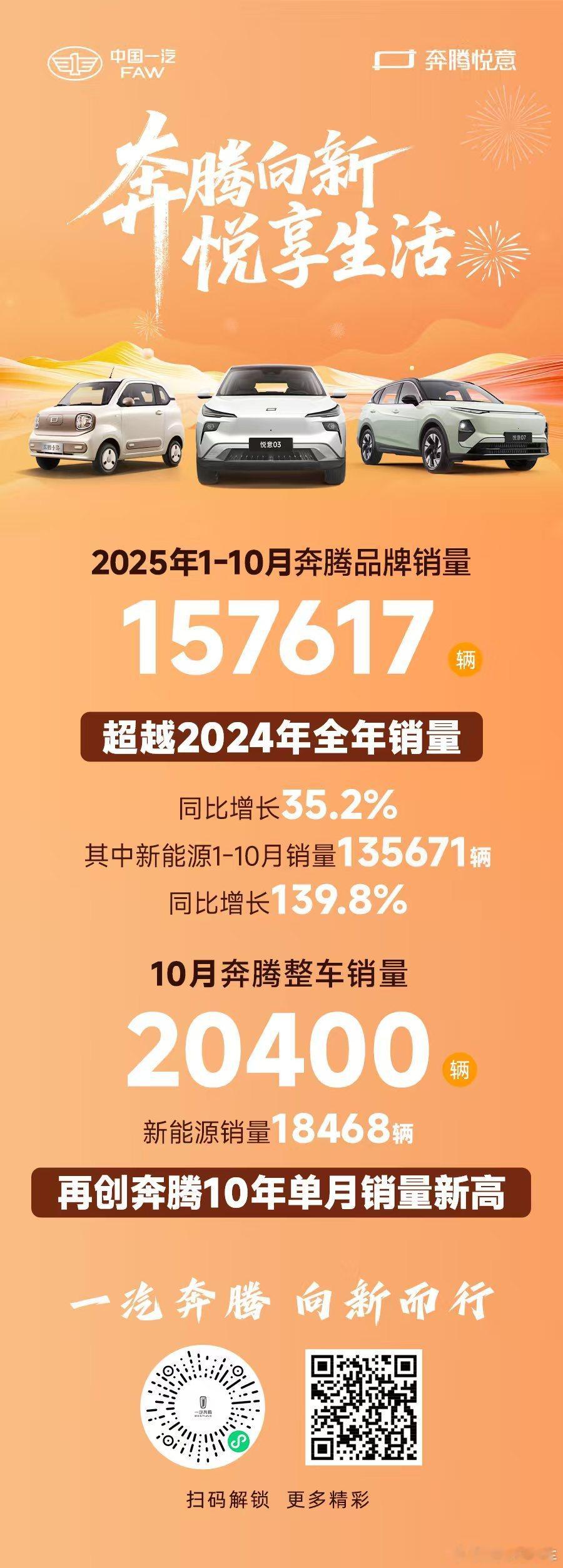 2025年1-10月奔腾品牌销量157617辆,超越2024年全年销量!