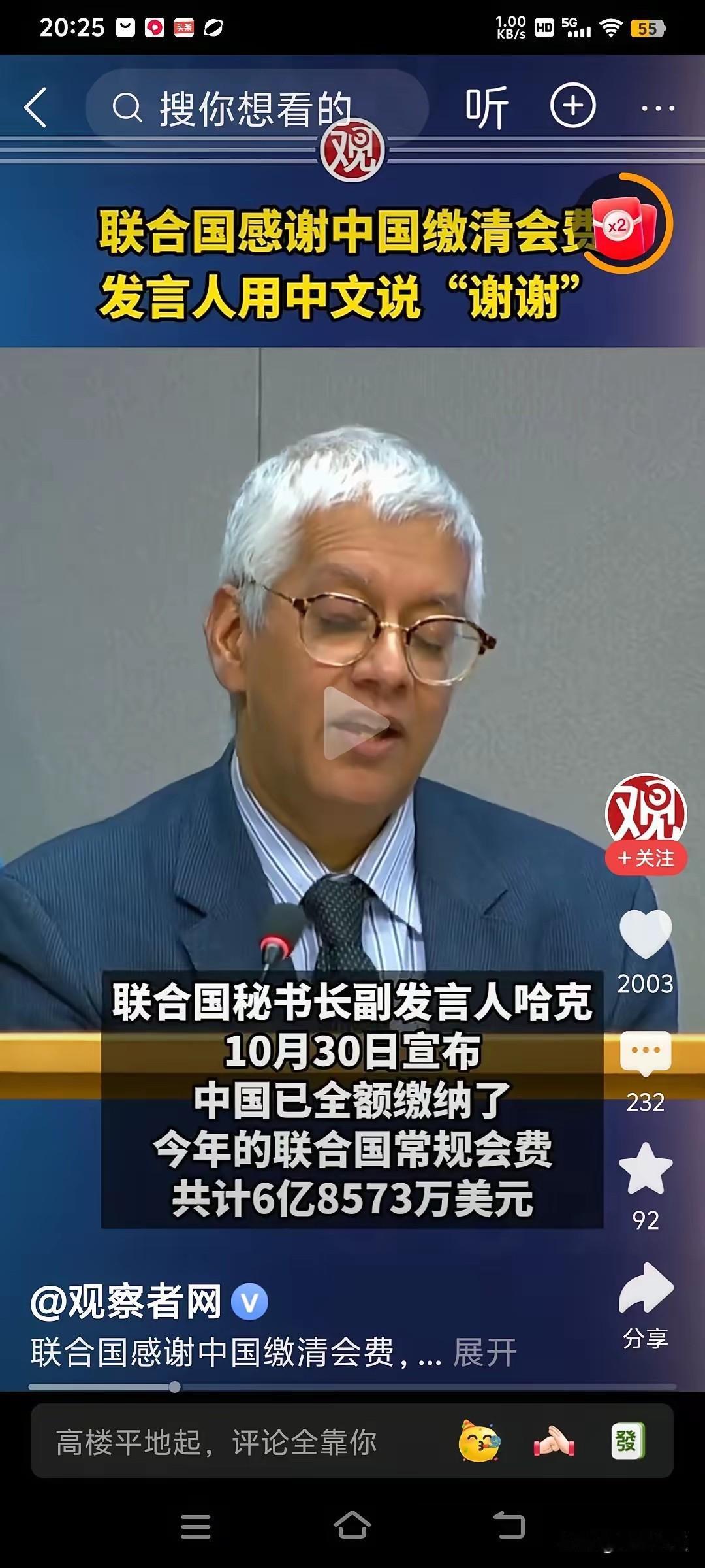 联合国感谢中国又缴清了今年的联合国会费,发言人宣布这一消息时禁不住用中文说“谢谢”! 联合国秘书长副发言人哈克10月30日宣布,中国已缴清了今年的联合国常规会费6亿8573万美元的会费。 中国带头足额的缴清联合国会费,对联合国的日常运转,无疑是提供了一定的保障。 中国是负责任的大国,是讲信用的! 联合国连自己内部成员国的会员费用催缴工作都没有做好,如何有能力处理好国际之间更加复杂的国际问题?自家的地都没有清扫干净,如何带领会员国去清扫世界垃圾?包含联合国搬迁在内的彻底改革已经是到了刻不容缓的地步了。