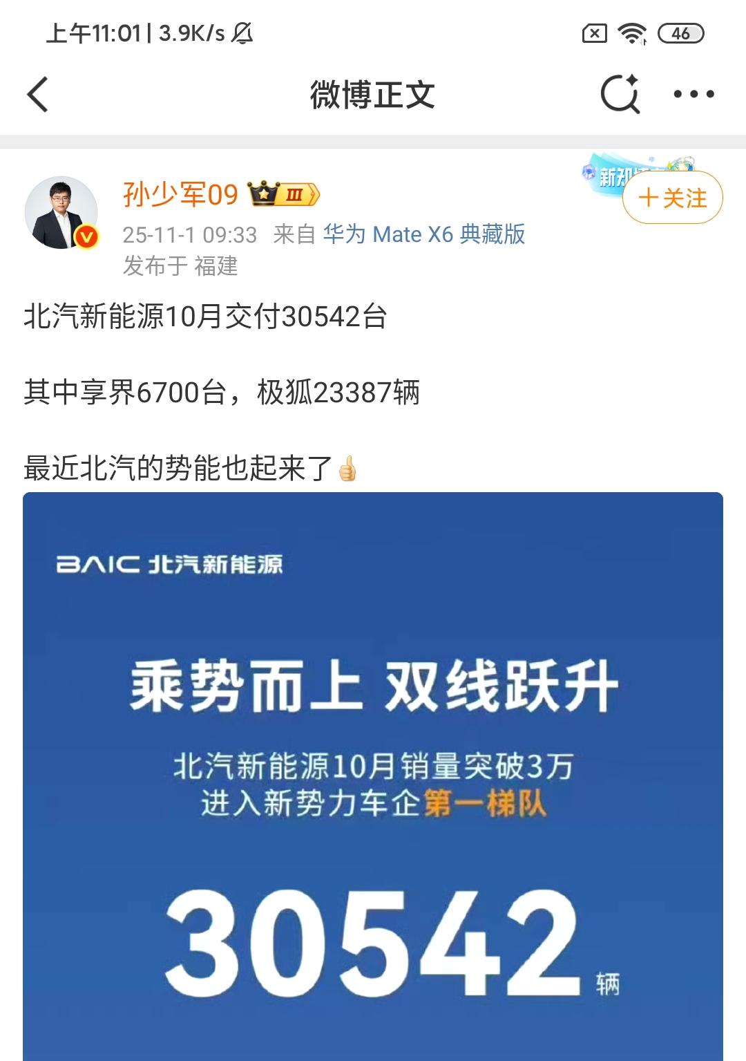 孙少军:北汽新能源10月交付30542台! 其中享界6700台,极狐23387辆,最近北汽的势能也起来了[赞] 感觉还是北汽新能源的路线走对了,果断停掉了其他的产品线。高端产品就依靠享界品牌去打开市场局面,跑量的车型就依靠极狐去打开市场局面。 现在已经让北汽新能源摆脱了低价网约车的形象,此前关于北汽新能源大家乘坐最多的就是各类的网约车。