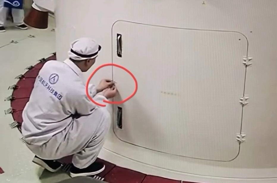 哈哈哈,这次神舟21号发射前,咱们的地面工作人员居然拿了一根普通的细铁丝用来锁整流罩舱门,这点属实没想到哦。