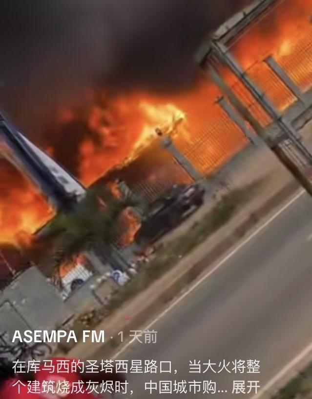 加纳库马西中国购物中心起火,中非员工因失业痛哭,10月30日下午,开业不足半年的中国购物中心着火,员工仓皇逃难,加纳国家消防局确认,火灾源于这栋大楼的仓库,整个商场化为灰烬,损失了数百万塞地,好在没有人员伤亡