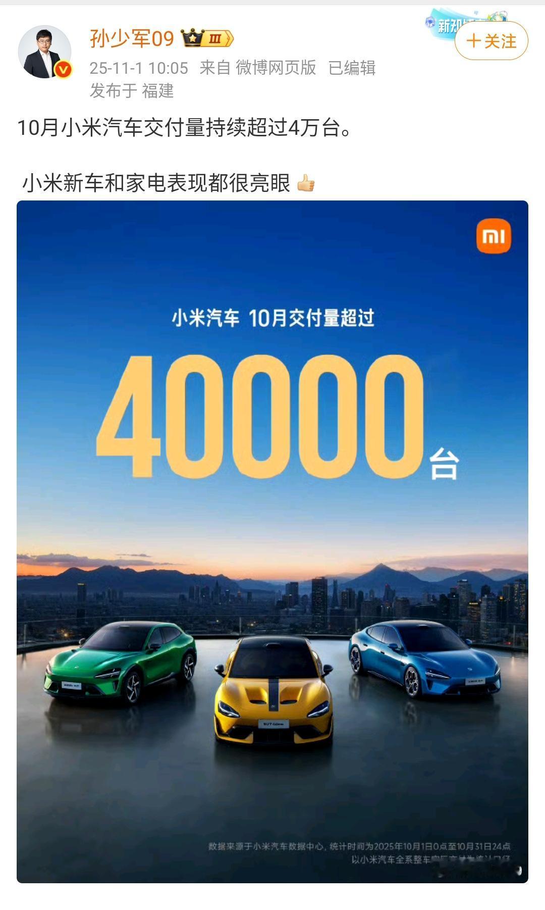 孙少军:10月小米汽车交付量持续超过4万台! 小米在10月份的交付量也持续超过了4万台,在11月份不知道能不能拿出更好的成绩,达到5万台的水平,小米汽车现在的最大的困境就是交付量提升不上来。 小米汽车现在的订单量也是在持续增加的,并不是像大家想象的,在发布会之后订单没有继续增长,而是每周都有几千辆订单再进来。 各位是怎么看的?欢迎评论区留言。