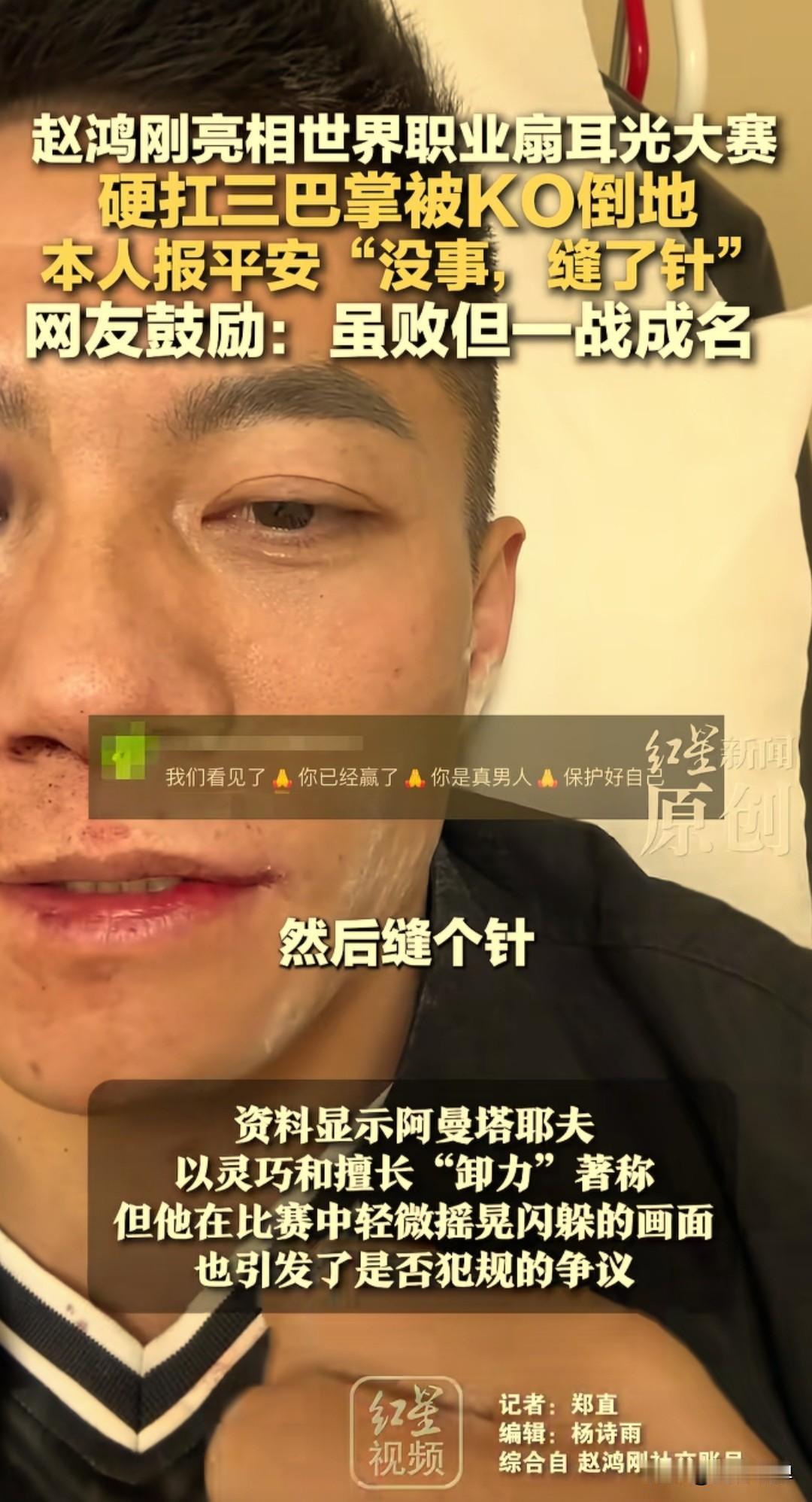 世界职业扇耳光大赛看起来真的是太残暴了,通背拳传人赵洪刚也强撑三轮被KO了,赛后赵洪刚发了视频报平安,说现在没啥事,缝个针就好。 比赛时间2025年11月1日,赵洪刚此次的对手是哈萨克斯坦选手阿曼塔耶夫,第一回合赵洪刚就被左眼眉骨打出血,脸颊红肿。 第二回合赵洪刚伤势加重,眉骨血流不止,左眼完全肿了起来,击打对手也未能给对方造成实质性伤害。 第三回合对手改用左手击打赵洪刚右脸,赵洪刚被直接KO晕倒在地,裁判随即终止比赛。 尽管此次输掉了比赛,也是代表中国选手在该项世界赛事中亮相,第一次尝试,赵洪刚在赛场上表现出的意志力也值得被尊重。 外国耳光大赛 扇巴掌挑战赛