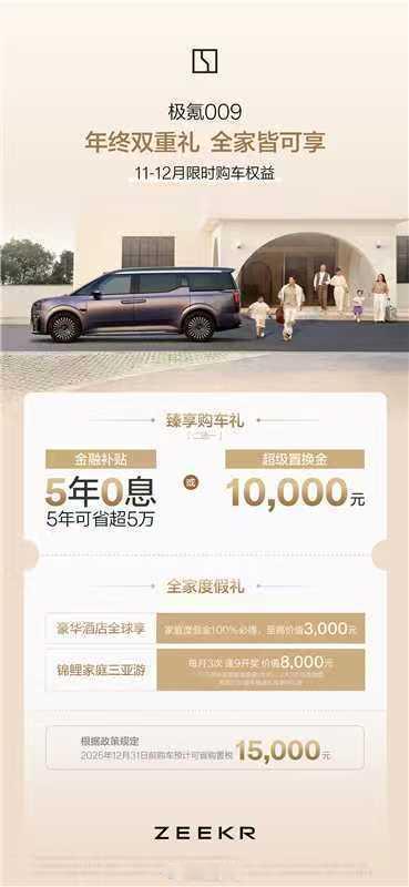 最近车企都在冲刺收集订单,八仙过海各显神通。双11 极氪009有个“旗舰级全家礼”,11月至12月限时政策,买车不仅享5年0息金融方案或万元置换金,还能100%抽中家庭度假基金,最高3000元,更有机会赢得价值8000元的“三亚万豪家庭奢旅”——含酒店套房、极氪009接送机、无边泳池下午茶。