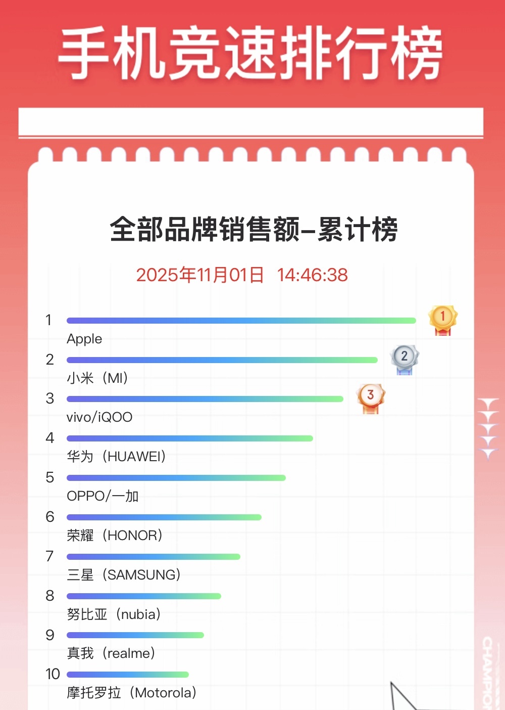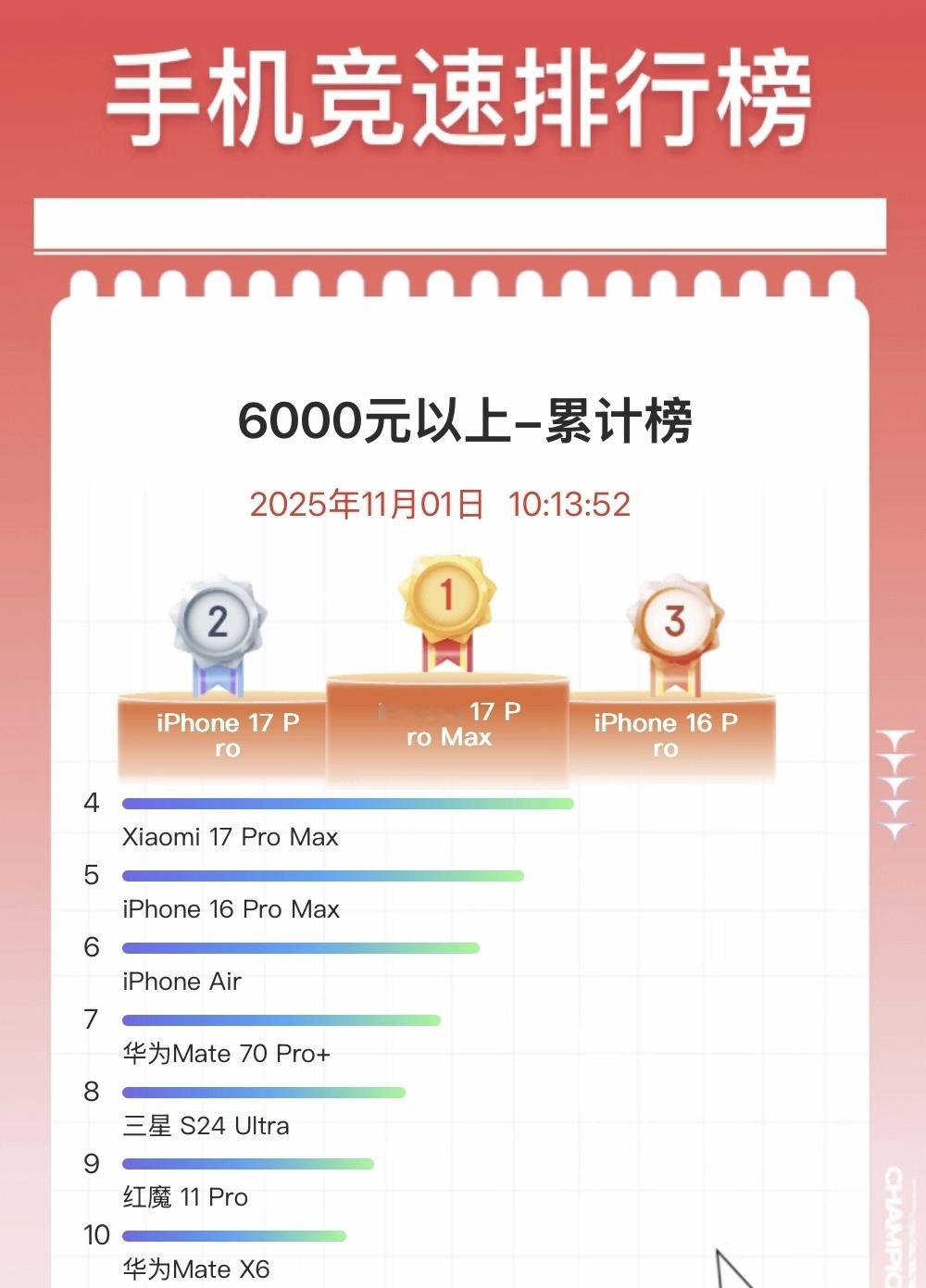 双十一半程苹果领跑小米紧随25年双十一促销季过半,根据京东双十一手机竞速榜数据显示:苹果摘得销量销额半程冠军,小米则紧随其后位居第二。同时代表高端机的6k+手机市场,苹果小米包揽机型销量前五,其中小米17 Pro Max则位居第四。