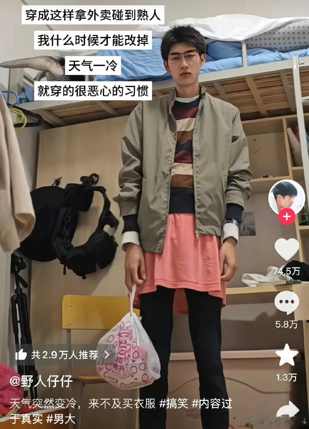 原来冬天大家都会这样的穿搭[捂脸] 气温骤降时,保暖成为唯一准则。 常见组合包括:睡衣裹羽绒服、睡裤套牛仔裤、秋裤外穿配拖鞋,甚至“捞到哪件穿哪件”的随机混搭。 网友自嘲:“体面是虚的,体温才是实的”。 你喜欢这样的搭配吗?