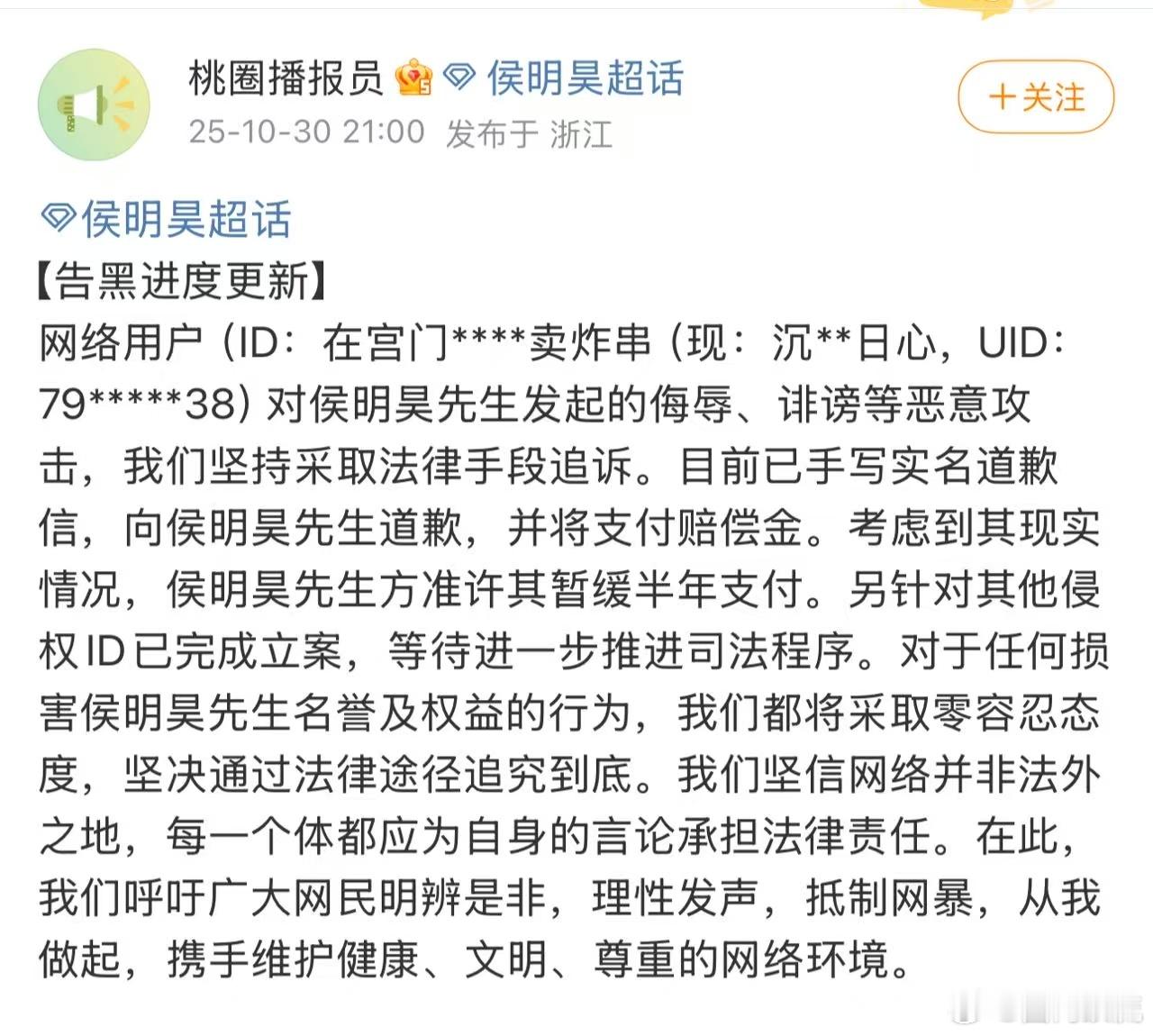 侯明昊告黑胜诉侯明昊黑粉手写道歉信恭喜侯明昊告黑胜诉!正义可能会迟到,但永远不会缺席。黑粉的实名手写道歉信就是最好的证明,侯明昊方准许缓期支付赔偿金也尽显大度。期待其他告黑案件也能顺利推进,期待新剧!侯明昊[超话]