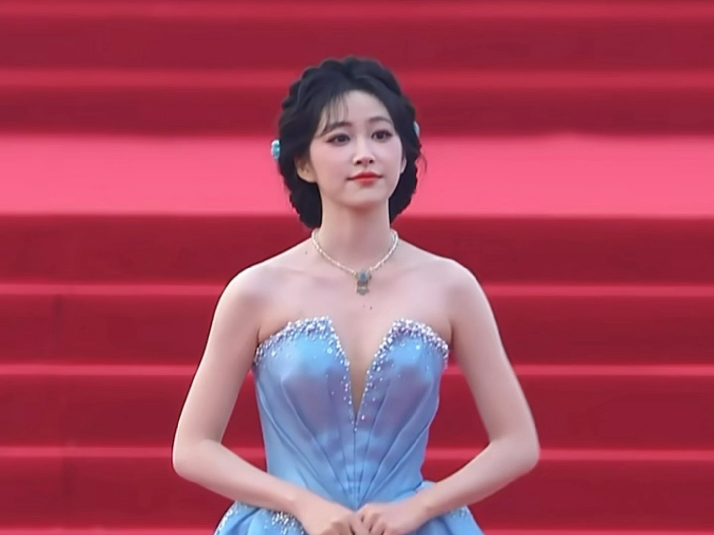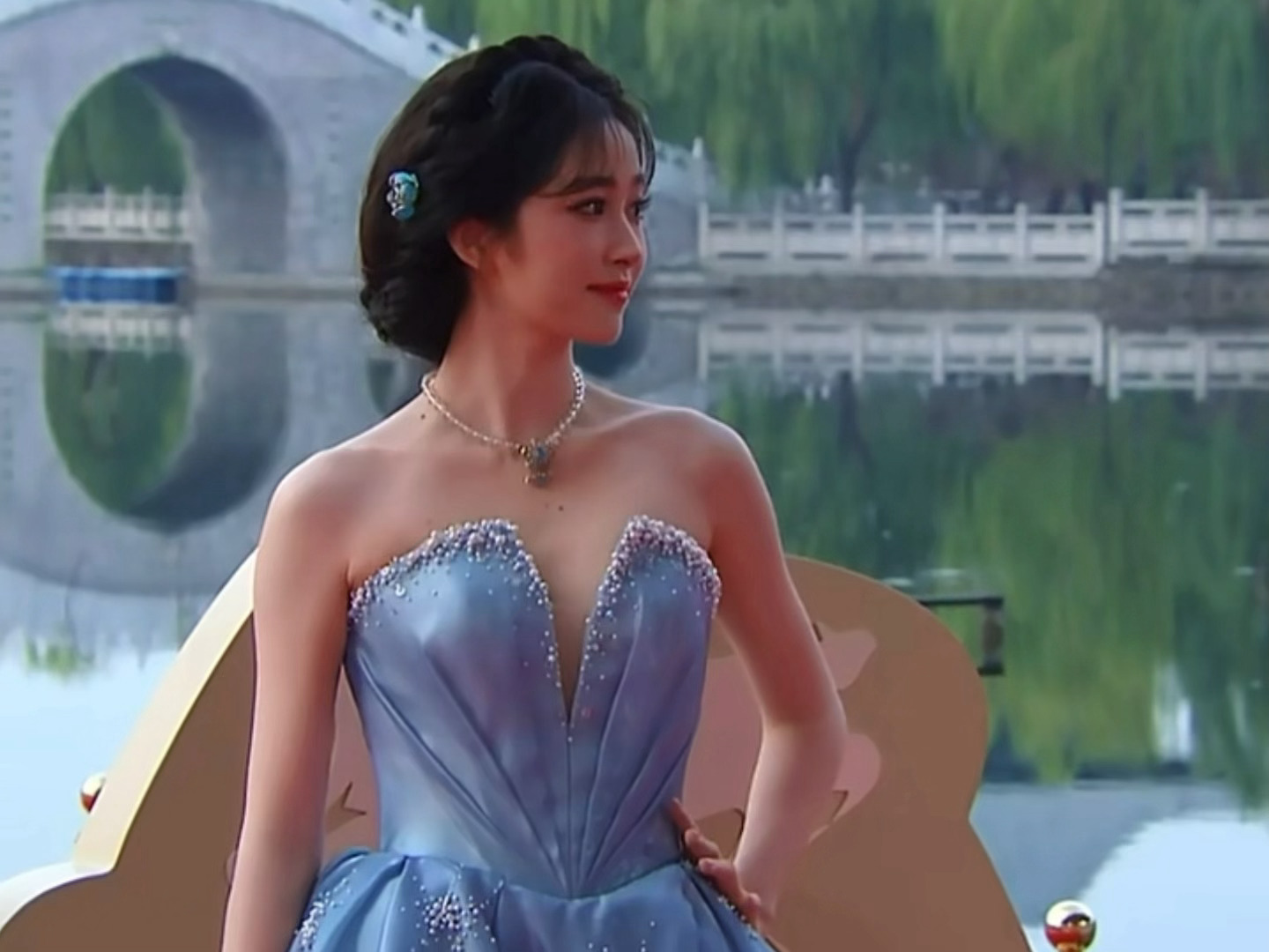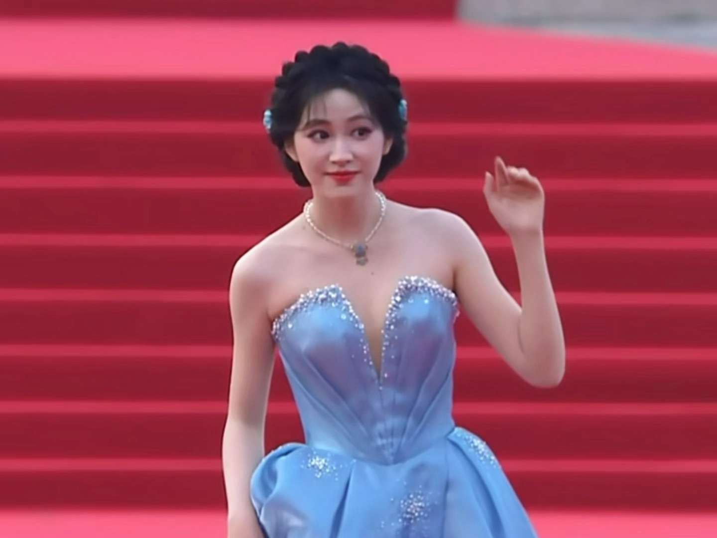 杨肸子盘发抹胸蓝裙造型