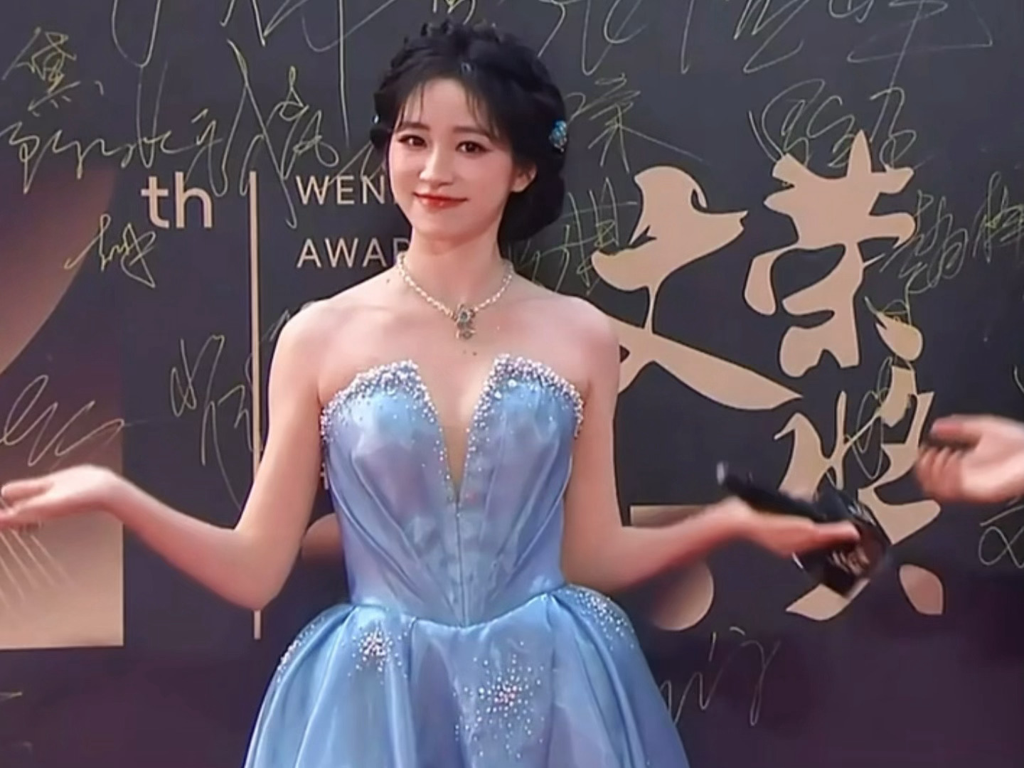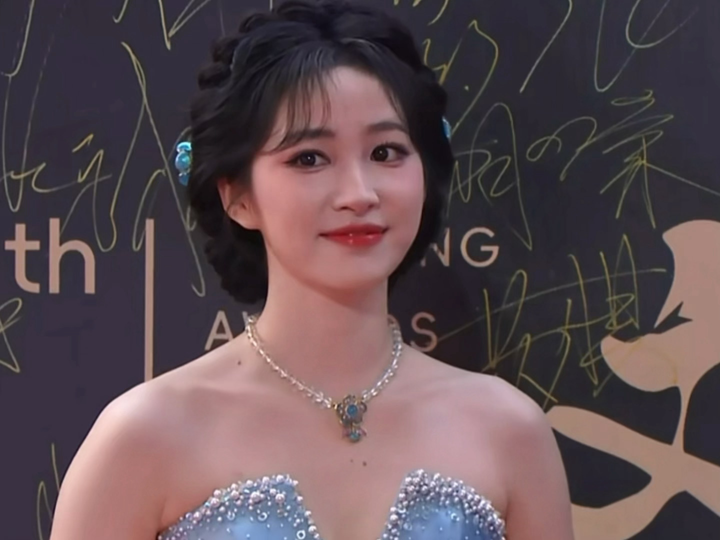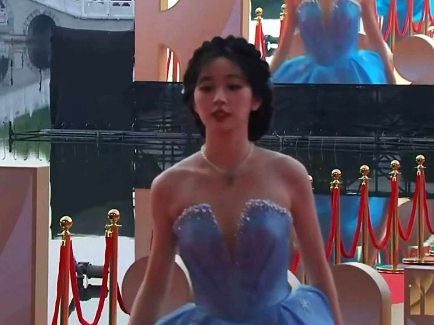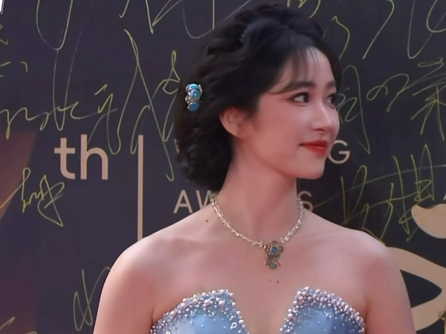杨肸子盘发抹胸蓝裙造型