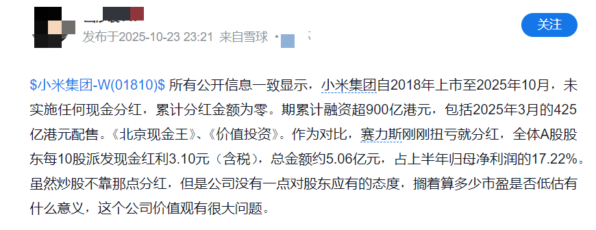 雪球上也有用户针对小米累计分红金额为零的情况表示,“虽然炒股不靠那点分红,但是公司没有一点对股东应有的态度。”