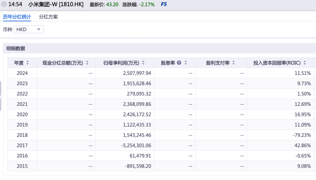 同花顺iFind数据显示,自2018年上市以来,截至今年10月,小米集团尚未实施任何现金分红,累计分红金额为“0”。