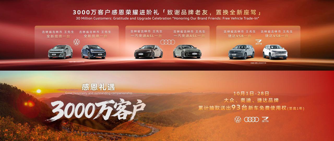 在长春“常回家看看”的活动现场,当主持人念出“3000万”时,我相信台下有不少老车主眼眶泛红——这不是新势力用PPT堆出的销量,而是一代代用户用钥匙转动出来的信任。更戳心的是,一汽大众悄悄攒了份“回礼”,截至活动当天,已累计送出100台新车使用权(揽境、奥迪、捷达都有),现场还抽了三位老客户额外获得一年使用权。