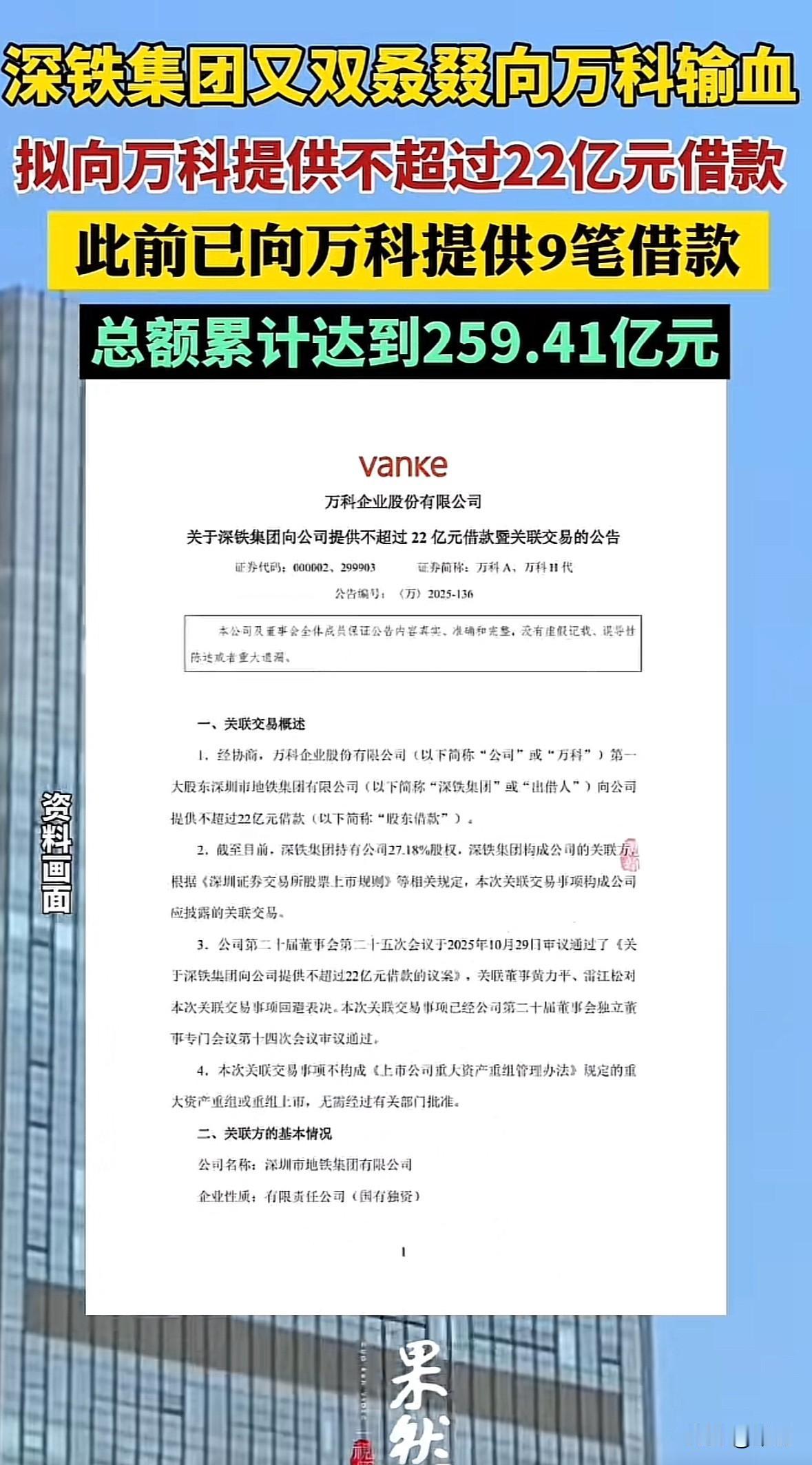 2025年深铁已10次给万科输血超281亿,最新22亿借款利率仅2.34%,低于市场水平。万科前三季度亏280亿,短期债务缺口超885亿,深铁自身也不好过,2024年亏334亿,2025上半年仍亏损。 深铁输血同时接管万科管理,这种支持能帮万科缓债务压力。但深铁自身负债率已超60%,持续输血压力大。万科也在盘活资产、保障交房自救,郁亮回岗带来一丝转机。 市场更期待两者产业协同产生实效,单靠资金输血难长久。房地产企业脱困,既需外部支持,更要自身找到可持续的盈利模式。