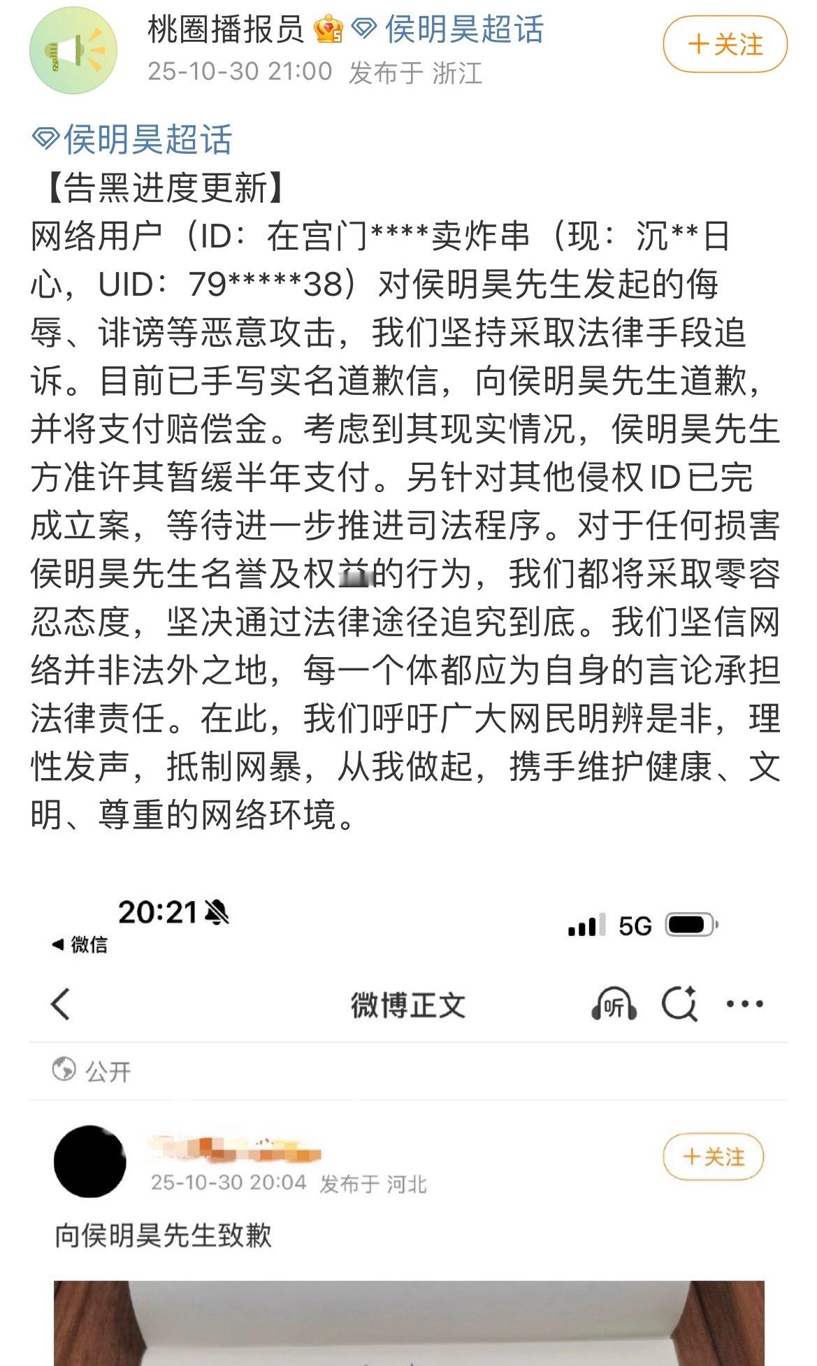 侯明昊告黑胜诉 恭喜侯明昊维权成功!黑粉已发布实名手写道歉信,侯明昊方更体谅其情况准许缓期支付赔偿,刚柔并济尽显格局。网络从非法外之地,造谣必受惩处。期待这位手握《逍遥》《玉茗茶骨》等好剧的演员,带来更多精彩作品!侯明昊黑粉手写道歉信