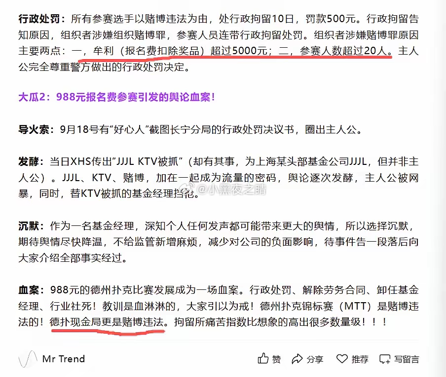 今天基金圈出来了一个文章,说是“赌博被拘留”的基金经理发声:说自己不是赌博,是参加德州扑克锦标赛 但是这比赛构成了赌博。