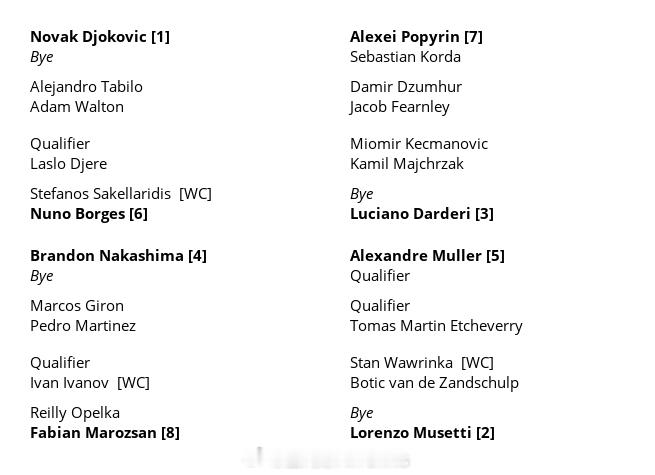 雅典:德约科维奇、穆塞蒂、达尔德里、中岛布兰登位列前四号种子。瓦林卡持外卡出战,首轮对阵范德尚舒尔普。