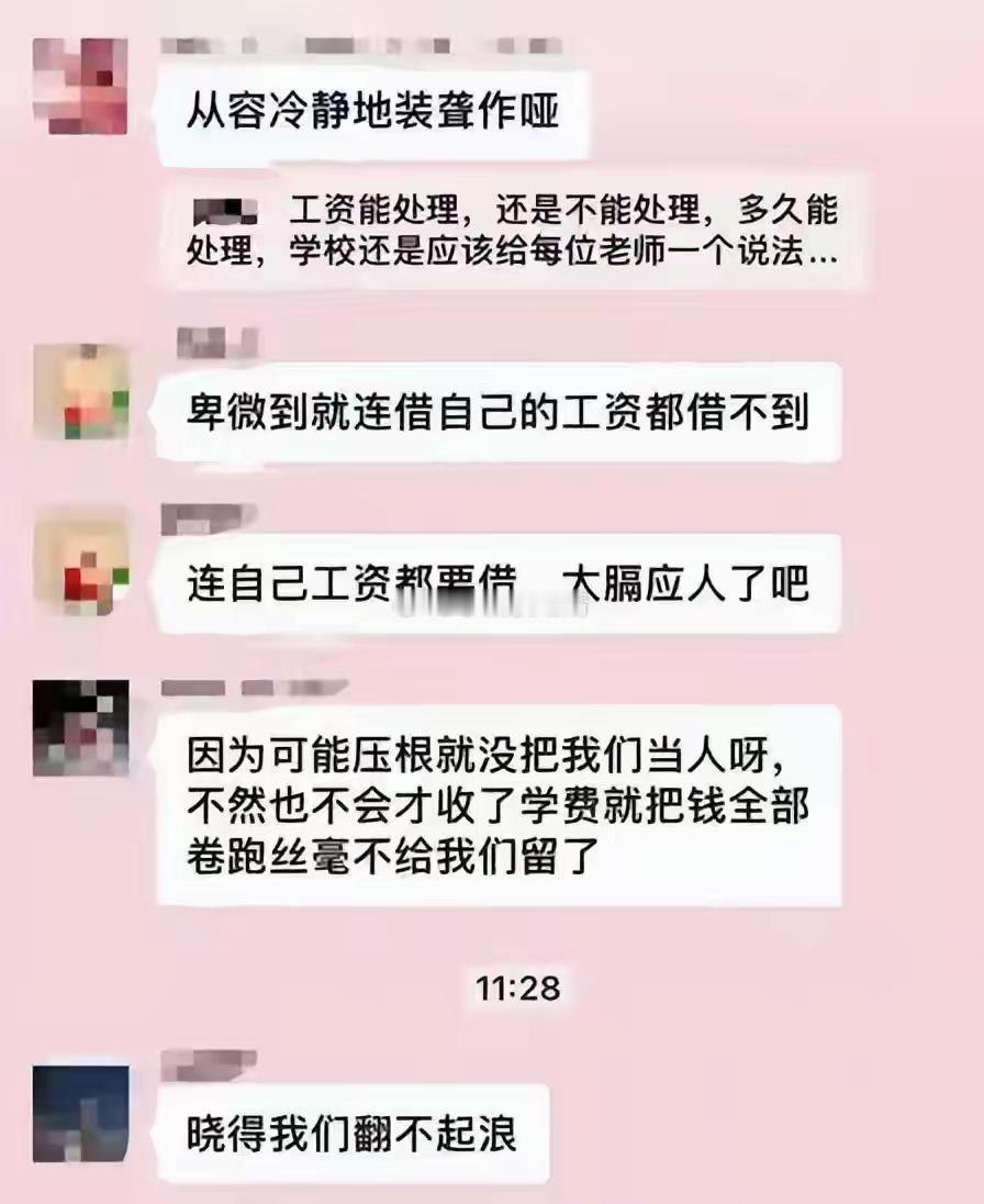“国庆发薪”“10月20日前结清”——岳池县师达实验学校的舒老师翻着聊天记录里的空头承诺,工资卡已经半年没收到过完整收入。据教师们透露,这所民办学校隶属于某房地产集团,今年秋季刚收的学费,全被集团拿去填补地产项目亏空的高利贷账目。“家长辛苦凑的学费救了开发商,我们的房贷、生活费却没了着落!”教师群里的催薪信息刷屏,满屏都是无奈的吐槽