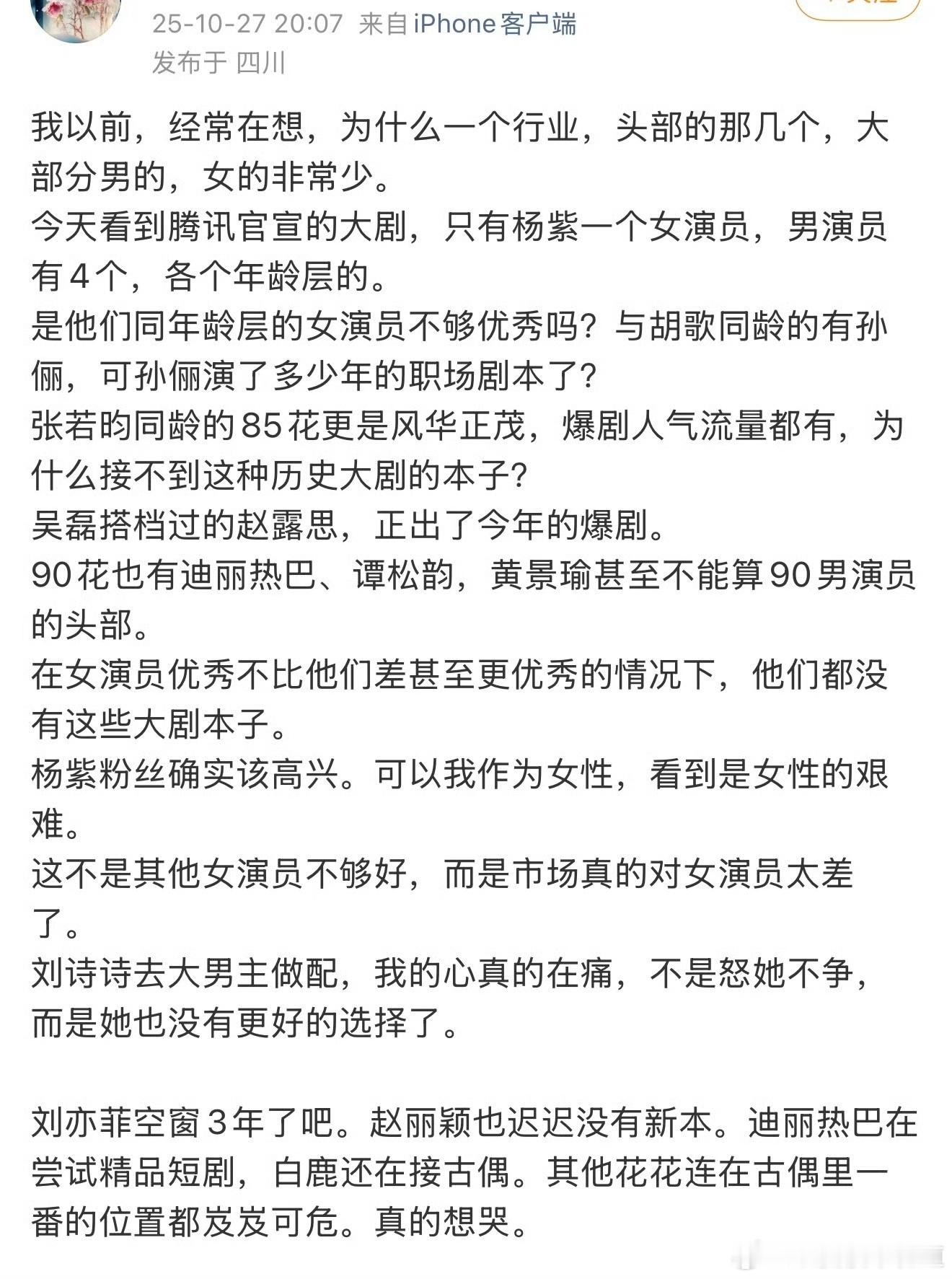 最后,恕我直言文中提到的女演员,有几个纵观她们的工作经历,她们的资源一直以来都不比杨紫差,甚至更好。无论是舆论环境还是资源分配待遇一直都比杨紫好。