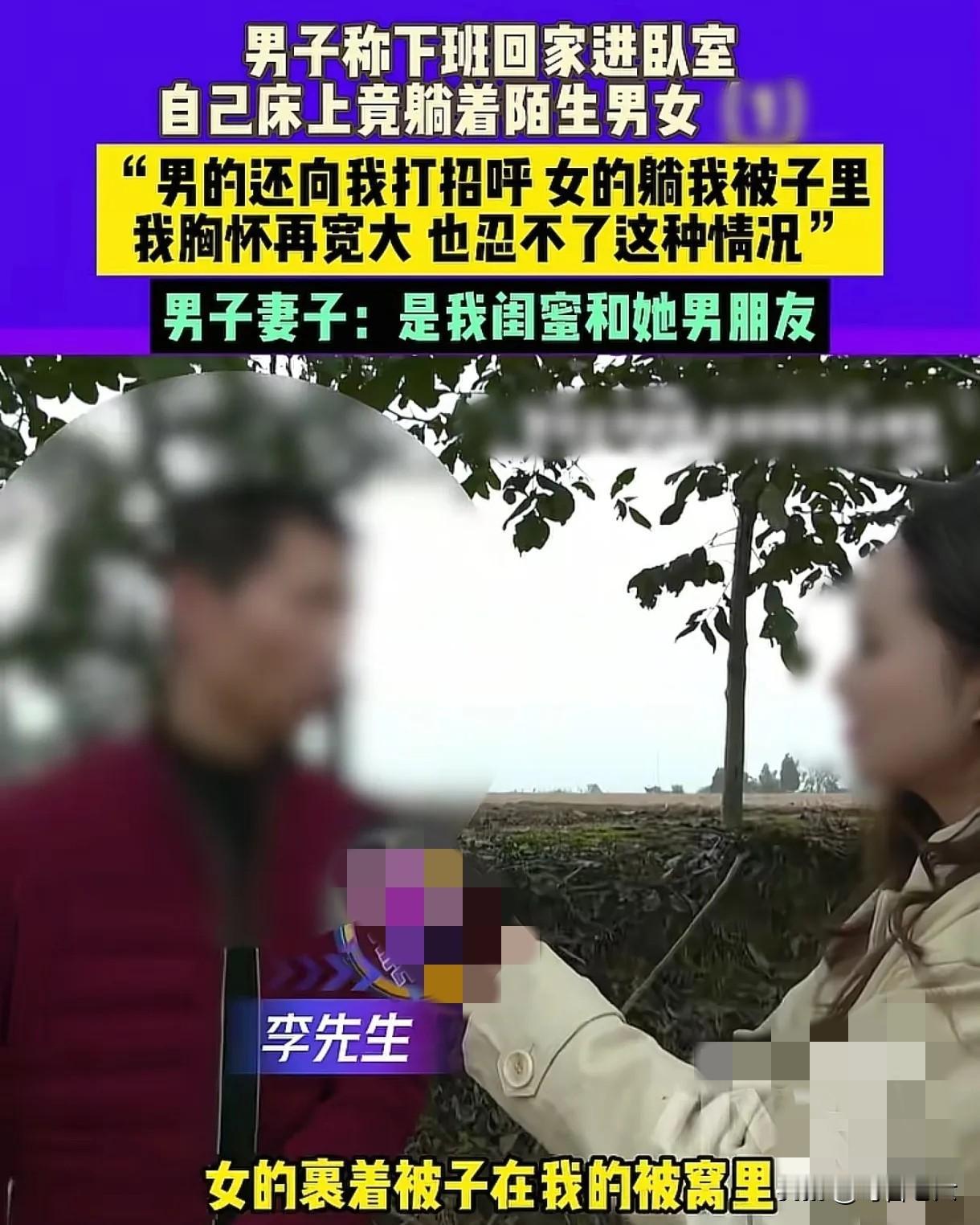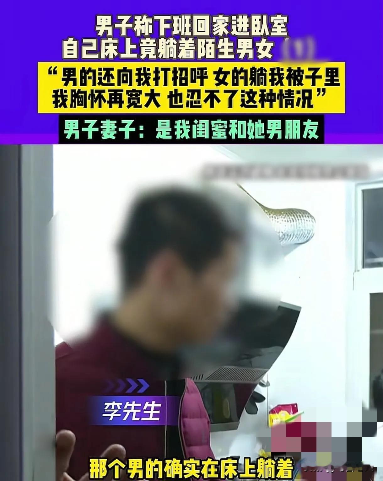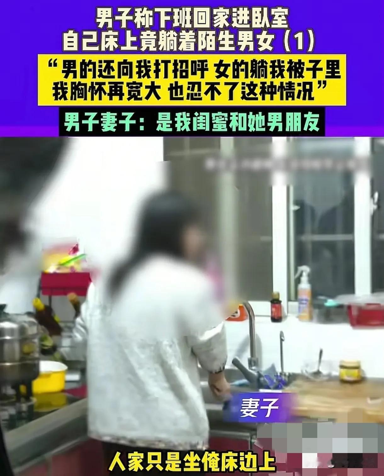 河南郑州,男子下班回家,却看到一对陌生男女躺在自己床上,瞬间懵了,可在厨房做饭的妻子却让他不要吭声,说那是自己闺蜜和闺蜜男友。男子接受不了:妻子闺蜜太多了,在自己家吃喝玩乐就算了,竟然还睡自己的主卧,他觉得很恶心。可妻子接下来的做法,却让他更加的愤怒。 李先生攥着钥匙站在卧室门口,听厨房抽油烟机的动静,压着火喊妻子出来。妻子擦着手出来。 瞥了眼床上的两人,轻描淡写:“我闺蜜带对象来,没地方住嘛,你凑合一晚怎么了?”李先生急了:“凑合?这是我跟你的婚床! 之前她们来吃饭我忍了,现在直接躺主卧,当我这是快捷酒店?”妻子撇撇嘴:“至于上纲上线吗?都是女的,能有什么事? ”这下李先生彻底炸了——不是防着她们干坏事,是自己和妻子的私密空间被当公共客厅,妻子的边界感比纸还薄,这日子还过不过? 各位读者你们怎么看?欢迎在评论区讨论。