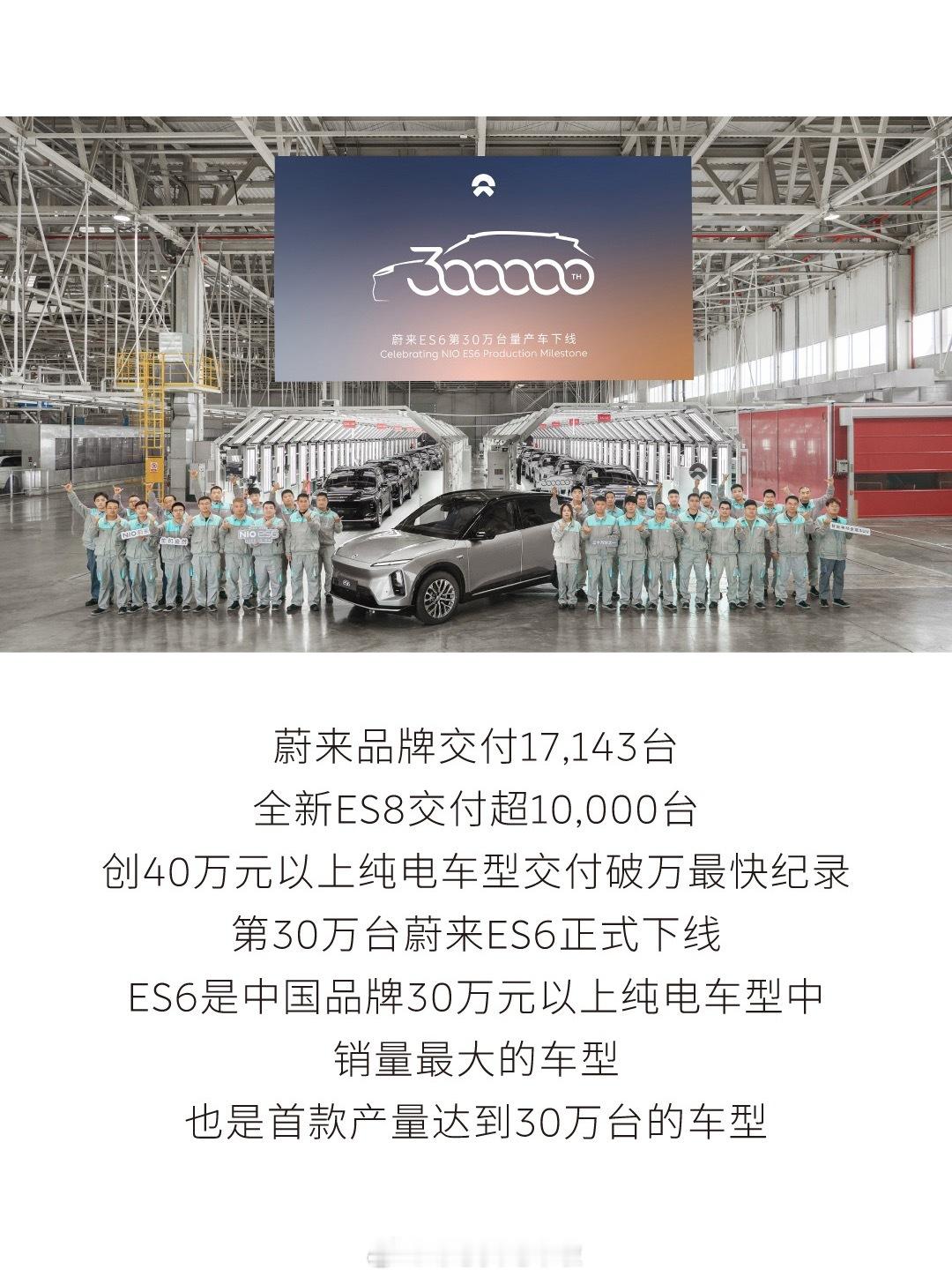 蔚来品牌17143台:全新ES8交付破万,成40万+纯电最快破万车型;第30万台ES6下线,稳坐30万+纯电销冠。
