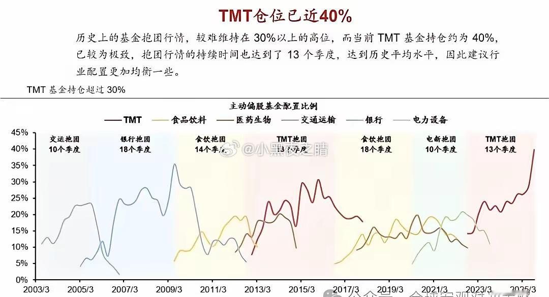 历史上的基金抱团行情,较难维持在 30%以上的高位,而当前TMT基金持仓约为40%,已较为极致,抱团行情的持续时间也达到了13个季度,达到历史平均水平!